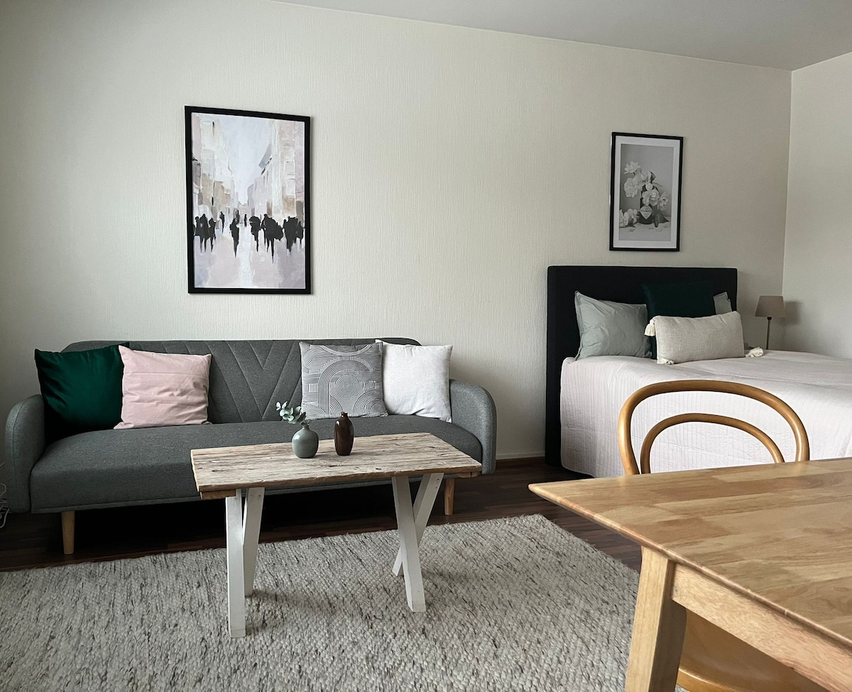Asunto on kodikas ja valoisa yksiö alle kymmenen minuutin kävelymatkan päässä keskustasta. Asunnossa on uusi mukava sänky ja levitettävä vuodesohva. Keittiö on kompakti mutta erittäin hyvin varusteltu ja asunto sopiikin hyvin myös pidempiin majoittumisiin. Innokkaalle talviuimarille on uimapaikka vain 100 metrin päässä ja rannasta lähtee myös ihania ulkoilureittejä. Autolle löytyy talon pihasta tai viereiseltä kadulta ilmainen parkkipaikka. Talon edessä on bussipysäkki.