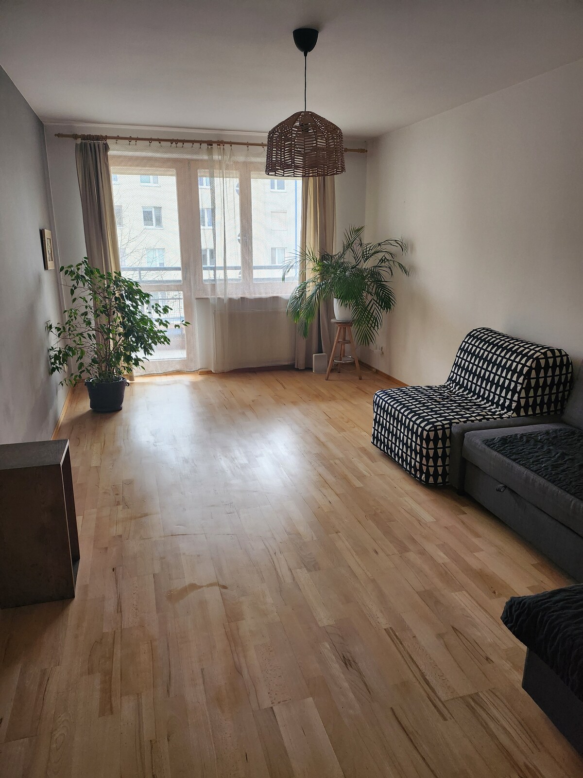 Sixth floor apartment in an elegant 10 story building with security entrance, nice wooden parquet, two sofa beds making room for 4 people to sleep, build-in wardrobe, bathroom with a bathtub and a shower and a washing machine.