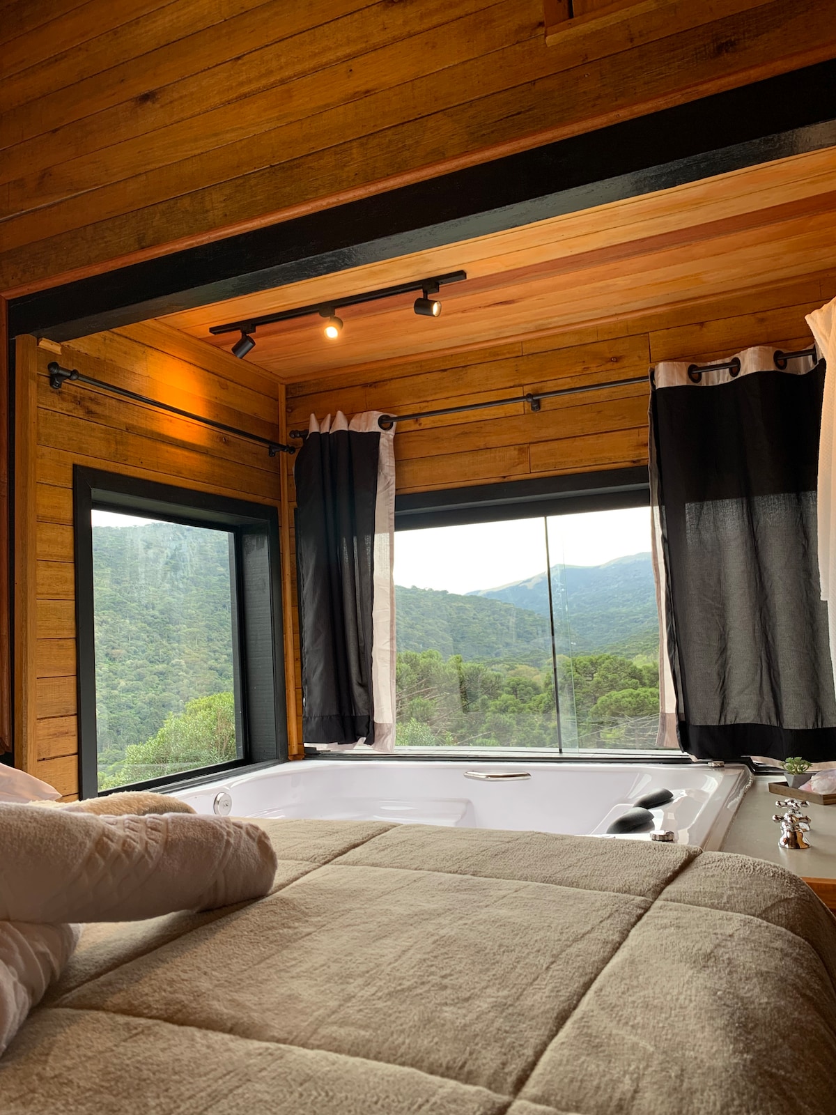 Nag - aalok ang Sirius Hut, na ipinangalan sa pinakamaliwanag na bituin sa kalangitan sa gabi, ng natatanging karanasan. May wine cellar, heater, hydromassage spa para sa 4 na tao at malawak na tanawin ng kagubatan ng Goiabeiras. Dalawang queen bed na may 800 thread cotton bedding, Trussardi bath, mga de - kuryenteng tuwalya at high speed internet. Tinitiyak ng mga pader na may thermal/acoustic insulation ang kapanatagan ng isip. Sa deck, masiyahan sa fireplace at barbecue habang may mga tanawin ng ilog, kagubatan, at bundok.