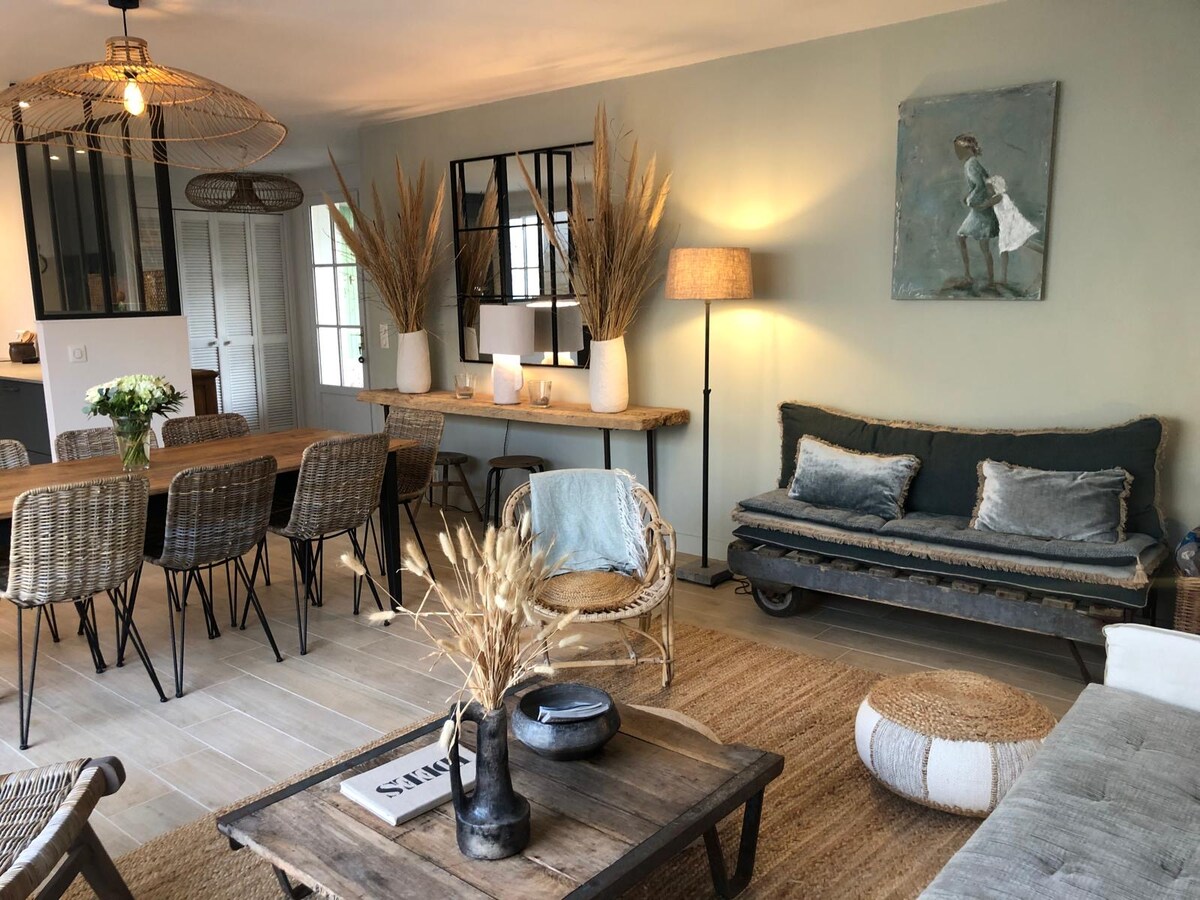 Magrelaks sa natatangi at tahimik na tuluyang ito na malapit sa mga beach, mula sa Whale Lighthouse na may direktang access sa daanan ng bisikleta. Sa malaking saradong hardin, makakapagpahinga ka nang tahimik at masisiguro mo ang kaligtasan ng mga maliliit. Ang bahay ay napaka - komportable: isang master bedroom, isang silid - tulugan na may mezzanine para sa pinakabata, dalawang banyo, isang kusina na bukas sa isang malaking napaka - cocoon na sala. Kakayahang magparada nang libre sa harap ng bahay. Tahimik na lugar