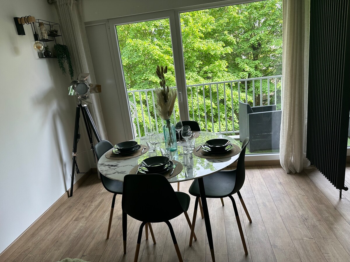 May mga bintanang mula sahig hanggang kisame at terrace, nag - aalok ang gite na ito ng malawak na tanawin ng Rouen. Ang naka - istilong lugar na ito ay may malaking maliwanag na sala na may kusina na bukas sa sala, remote na lugar ng trabaho, 2 silid - tulugan at 1 banyo. Bukod pa rito, matutuwa ka sa kaginhawaan, kalmado, at air conditioning. Libreng paradahan sa kalye Posibilidad na mag - park ng mga bisikleta, scooter o motorsiklo (garahe). 20 minutong lakad mula sa istasyon ng tren at sentro ng lungsod. Malapit na istasyon ng bus
