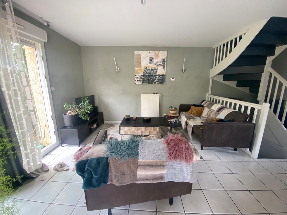 Profitez d'un logement élégant et central. Logement idéal pour voir la Coupe du monde de Rugby car il se situe à 40 minutes à pieds du stade Geoffroy Guichard et 10 minutes en voiture. Des trams et bus sont desservis toutes les 10 a 15 minutes. Le centre ville est à 10 minutes à pieds. Vous avez une terrasse avec un jardin. Et vous bénéficiez du calme tout en étant proche de toutes commodités. Je peux vous concocter des petits plats faits maison et petits déjeuners selon votre envie.