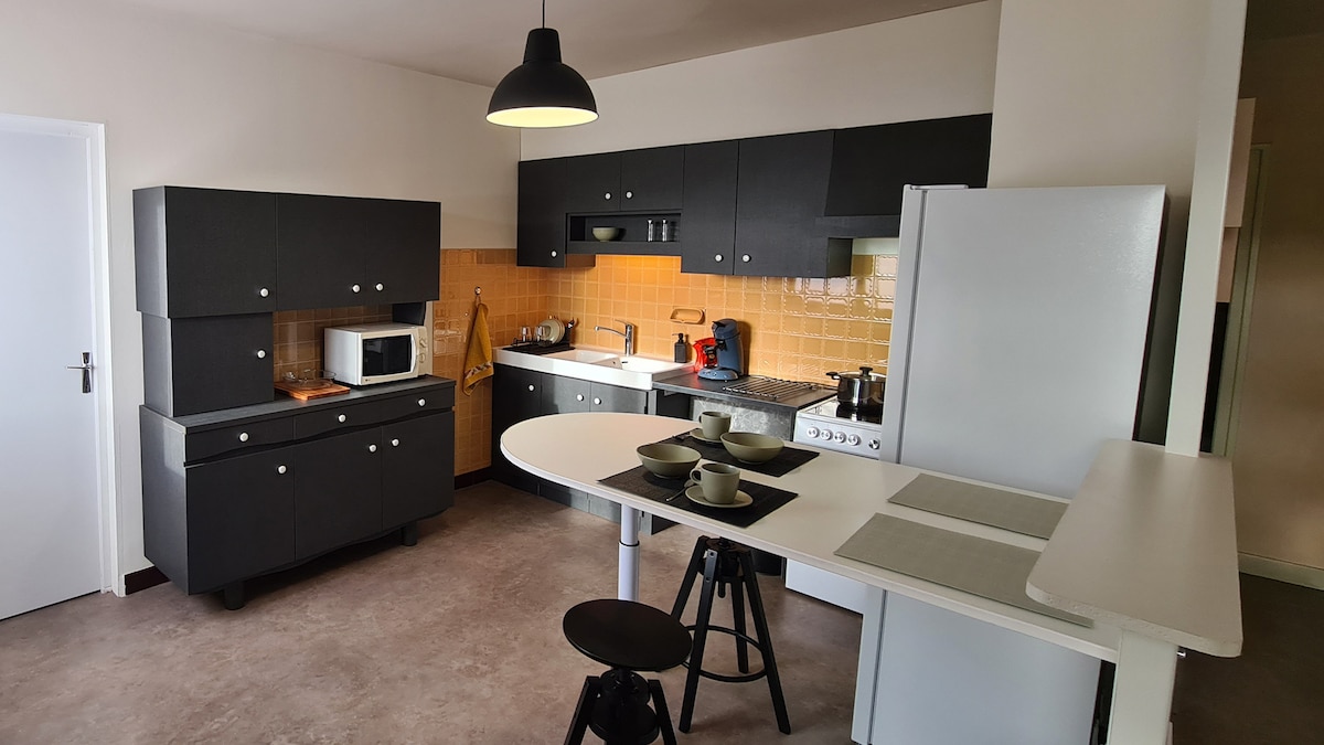 Malugod kang tinatanggap nina Gabrielle at Benjamin sa lumang kamalig ng kanilang bahay na maingat nilang inayos para gawing maliwanag na studio ito na 27 m2. Ang dekorasyon ay talagang kontemporaryo at makulay para sa sala at neo - retro para sa shower room. Ang kusina/lugar ng kainan ay may mga pangunahing kailangan upang magpainit o magluto ng mga solong pinggan. Matatagpuan sa hamlet ng Ballon kung saan matatanaw ang lungsod, nag - aalok ito sa iyo ng kalmado at kaginhawaan para sa iyong mga pamamalaging 2 gabi na minimum.
