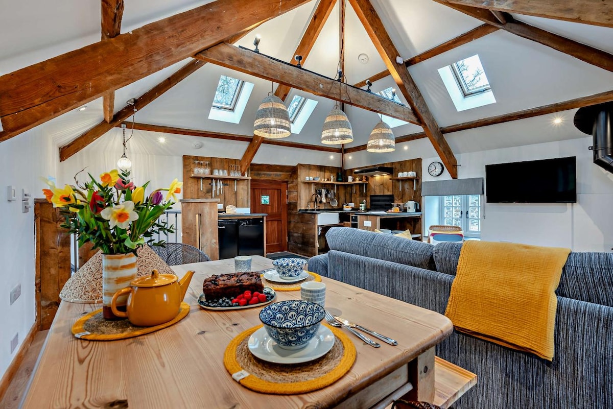 Puno ng karakter at kapayapaan (walang WIFI) ang kakaibang hiwalay na kamalig na ito. May bukas na planong kusina/sala na may komportableng log burner ( mga log na available sa £ 7 cash a net) at slate topped breakfast bar. Ang property ay may solidong sahig na oak sa buong lugar maliban sa slate sa banyo kaya huwag kalimutan ang iyong mga tsinelas! Kasama sa kusina ang oven, hob, refrigerator, toaster, microwave at kettle. Nagbubukas ang komportableng lugar na nakaupo sa kaakit - akit na patyo at damong - damong lugar. Paumanhin, walang alagang hayop