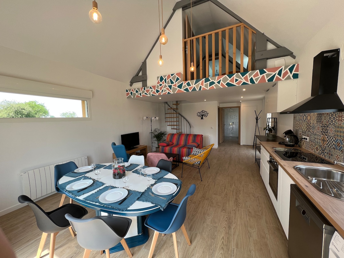 May perpektong kinalalagyan para bisitahin ang lahat ng tourist spot ng Normandy: sa pagitan ng Etretat, Honfleur, Le Havre Nag - aalok ang cottage na ito na may pinong dekorasyon ng master suite na may jaccuzi, sauna at xxl shower, silid - tulugan na may queen size bed, malaking terrace, maliwanag na sala na may sofa bed at kusinang kumpleto sa kagamitan. Ang cottage ay may lahat ng kailangan mo para makapagpahinga at makapagpahinga. May mga pribadong parking space na Sheet at tuwalya Inaalok ang kape at tsaa