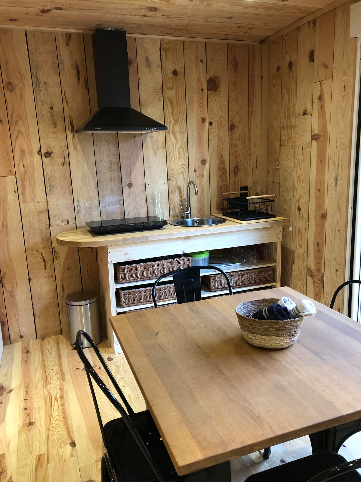 Small wooden house located in a very quiet and wooded place, on the edge of the forest. Easy access to the beach on foot or by cycle path. For ecological reasons, for one or two nights, bringing your own linen is welcome :) otherwise charged €15 on arrival and upon prior request. Cleaning at your convenience or charged €15 and free from 3 nights Capacity: 2 adults