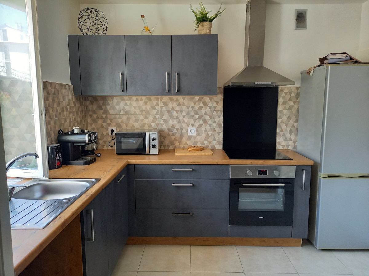 Pamamahagi ng bahay sa pamamagitan ng iba 't ibang antas na may lahat ng kaginhawaan para ma - enjoy ang magagandang tanawin ng Pyrenees. Living room 1m fireplace at 6pax sofa Kusina Gaggenau kumpleto sa kagamitan Silid - kainan: Kahoy na mesa 6 na tao Dalawang palapag na family room 2 + 2: king size bed (1.80 x 2) sa isang two - level suite room. Sa ikalawang antas, dalawang single bed (2 x 1.90 x 0.80). Banyo: Malaking microcement bathtub pati na rin ang shower - rain shower - Terrace at barbecue: Kahoy na mesa para sa 6 na tao at barbecue