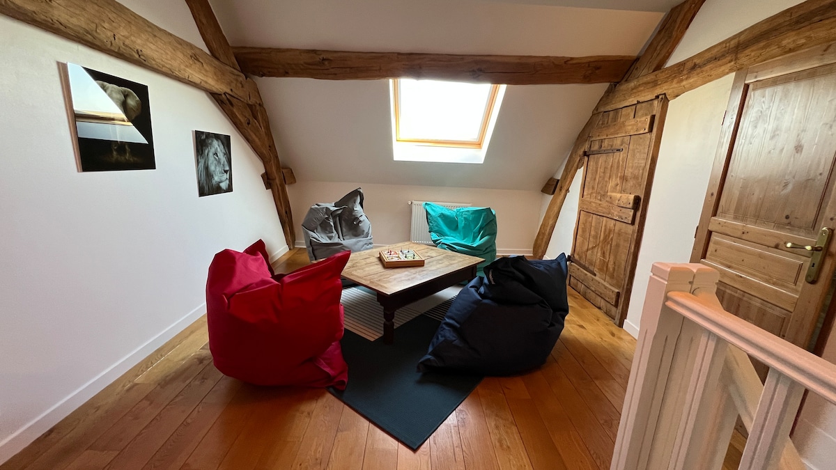 Binibigyan ka namin ng independiyenteng tuluyan na 37 m2 sa aming bahay. Binubuo ito ng maluwang na pasukan na naghahain ng shower room, hiwalay na toilet, at sala na nagbibigay sa iyo ng access sa nakamamanghang at tahimik na tanawin ng nakapaligid na kanayunan. Ang isang maliit na kusina ay magbibigay - daan sa iyo na kumain. Higaan 140/190 uri ng Futon. Available ang mga linen at hand towel.
