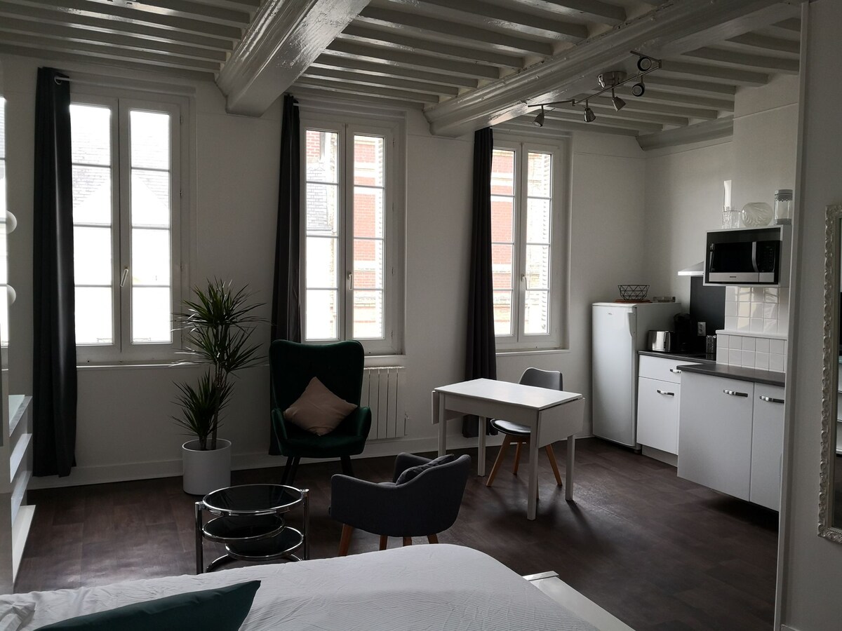 Sa gitna ng makasaysayang sentro ng Montivilliers, hindi pangkaraniwang town house sa quadruplex, na ganap na na - renovate na interior na 57m² na nasa ground floor ng kusina na nilagyan ng + 1 WC, sa ika -1 palapag ng sala na may koneksyon sa hibla at pinagsama - sama ng Chromecast TV at maliit na sulok na opisina, 2nd floor bathroom (shower) + relaxation area (posibilidad na matulog 1 pers.), 3rd floor double bedroom attic bed na may nakalantad na beam.