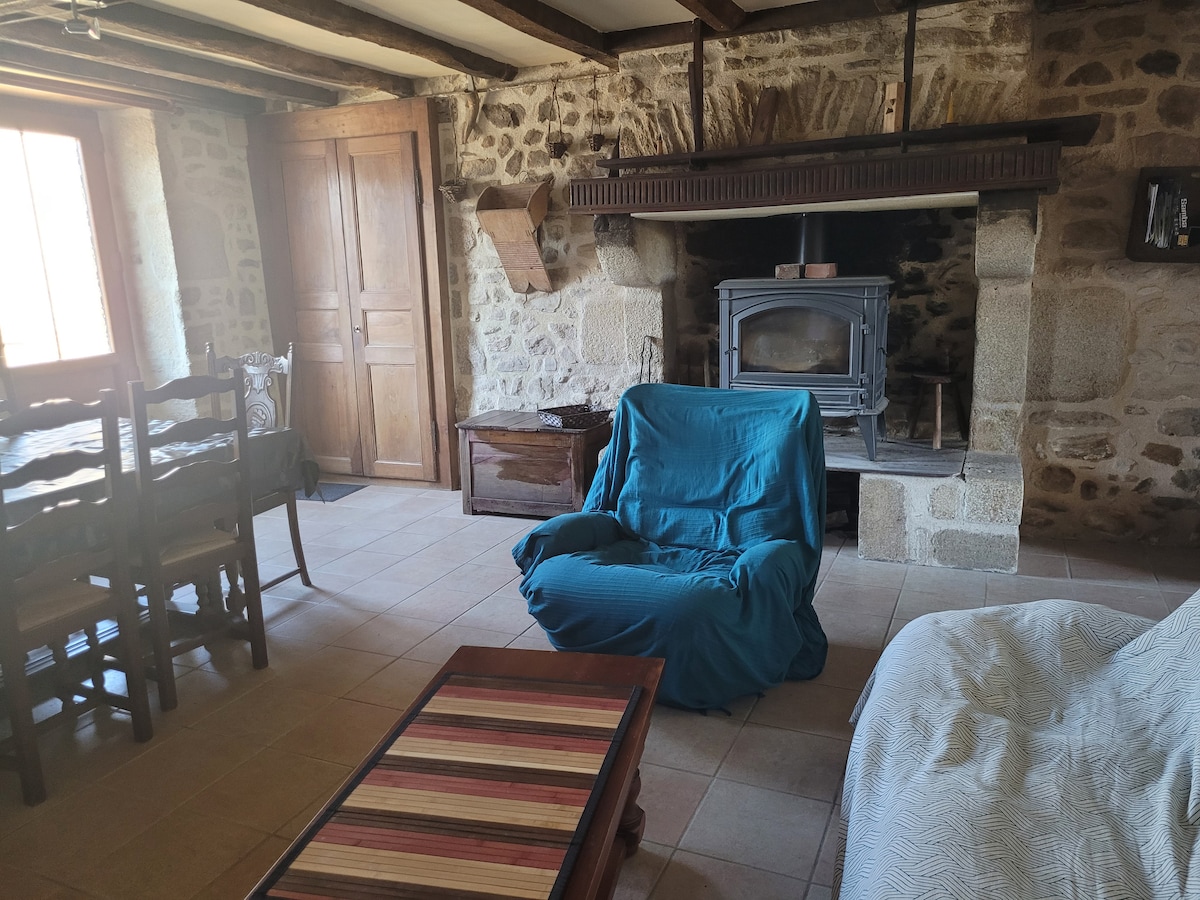 Gite sa isang lumang bahay na bato na binubuo ng isang malaking kuwarto na may sleeping area (160 na higaan) at isang lounge area na may kalan ng kahoy para sa kasiyahan ng apoy sa taglamig halimbawa, isang kusina at banyo (shower) at wc. Isang nakapaloob na bakuran na may damo at may mesa/mga upuan at barbecue (ikaw ang bahala ng uling) kung saan maaaring magparada ng sasakyan. Tahimik ang lahat. Inihahanda ang higaan pagdating mo, may toilet linen at kusinang linen, toilet paper, at mga produktong pambahay.