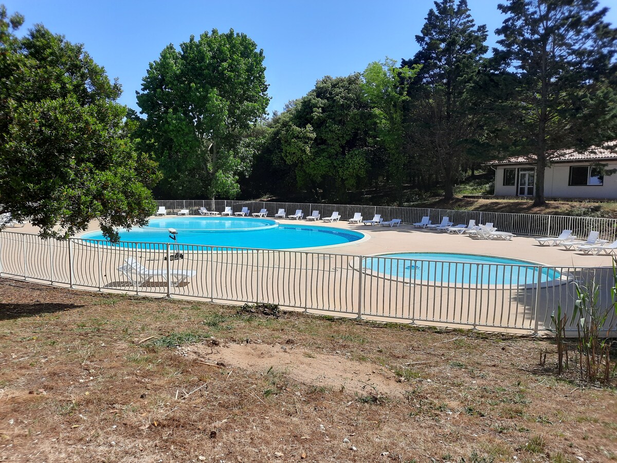 Matatagpuan sa loob ng isang napaka - tahimik na tirahan na may mga swimming pool sa isang wooded park, halika at tamasahin ang kaaya - ayang maliit na terraced house na ito sa isang antas na binubuo ng sala na may sofa bed para sa dalawang tao, isang bukas na kusina, isang silid - tulugan, isang banyo at isang hiwalay na toilet. Ginagawang posible ng maliit na terrace na pahabain ang iyong mga gabi nang kaaya - aya. Dahil sa lapit ng mga daanan ng bisikleta, madaling makapaglibot sa bayan o sa beach na 2 km ang layo. Available ang mga swimming pool mula Hunyo 01 hanggang Setyembre 15.