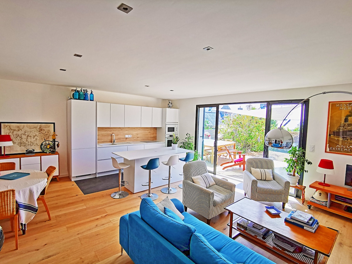 Maligayang Pagdating! Naihatid noong Pebrero 2019. Matatagpuan sa gitna ng Quiberonpeninsula, ang aming bahay ay idinisenyo para sa 6 na tao (+1 para sa pag - troubleshoot na may 1 solong higaan) ay may maraming pakinabang: 400m mula sa sentro ng lungsod ng ST Pierre Quiberon at 550m mula sa beach sa gilid ng Bay, perpekto para sa mga bata dahil protektado mula sa umiiral na hangin... At ilang hakbang pa mula sa Grande Plage sa gilid ng Karagatan, napakapopular para sa surfing, windsurfing, kite surfing, paglalakad sa paglubog ng araw, atbp .