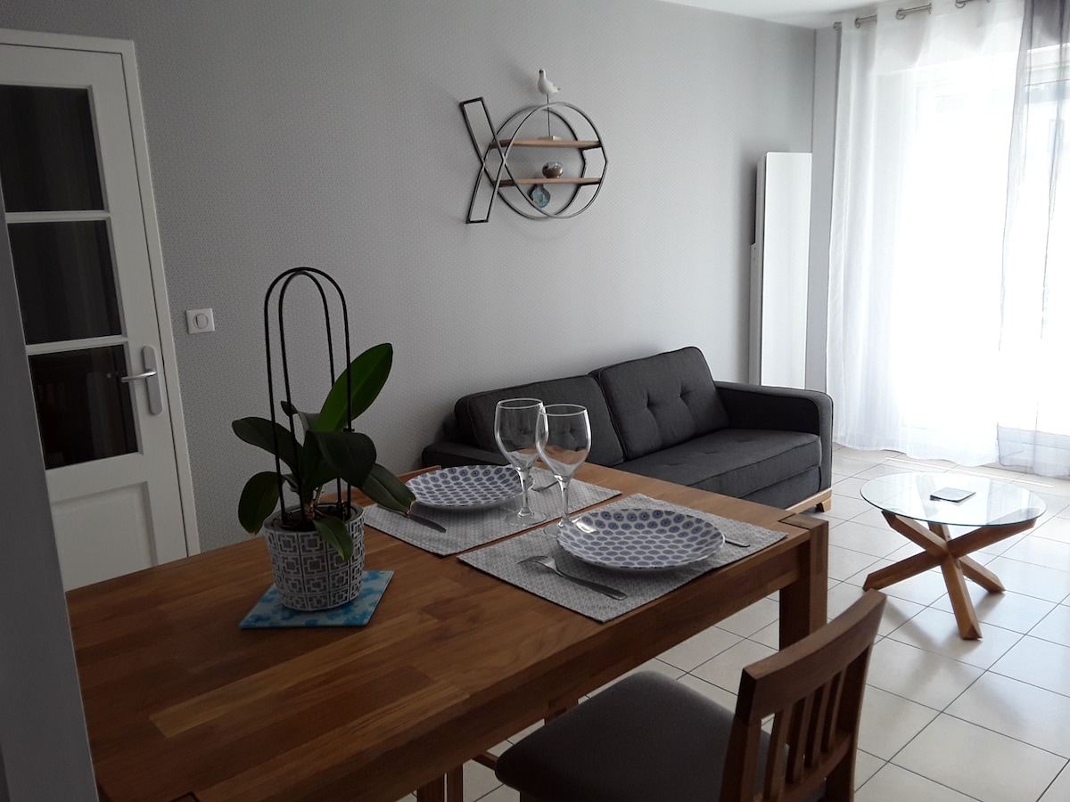 Maginhawa at mainit - init na apartment na 46 m2 na may kagamitan sa timog na terrace, na nasa ground floor (32m2) sa isang kamakailan at tahimik na tirahan. Mainit sa taglamig. Libreng paradahan 5 minutong lakad papunta sa istasyon ng tren na malapit sa mga tindahan, 15 minutong lakad papunta sa makasaysayang lungsod at mga beach Ibinibigay ang bedding kapag hiniling: € 10 bawat higaan para sa pamamalagi Walang bayad ang mga tuwalya sa banyo Isang ika -2 palikuran na hiwalay sa paliguan Libreng Wi - Fi Nbrx malapit na restawran magluto sa take away. Posible ang trabaho sa TV