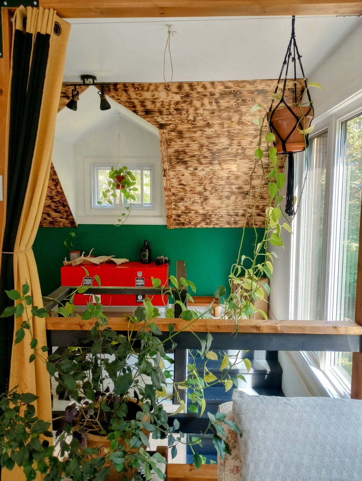 Petite maison canadienne qui se veut, à la fois, une galerie d'art et un hébergement pour les gens de passage. Située sur une rue sans-issue, à flanc de montagne, l'espace vous offre un terrain boisé et un spa, fonctionnel à l’année. Tranquilité assurée! À proximité (10 min) des villages de Val-David (plein-air/escalade/vélo de montagne/arts) et du Lac-Masson (plage/patin libre sur le lac en hiver), du Petit Train du Nord et près des principaux monts de ski des Laurentides. CITQ 307821