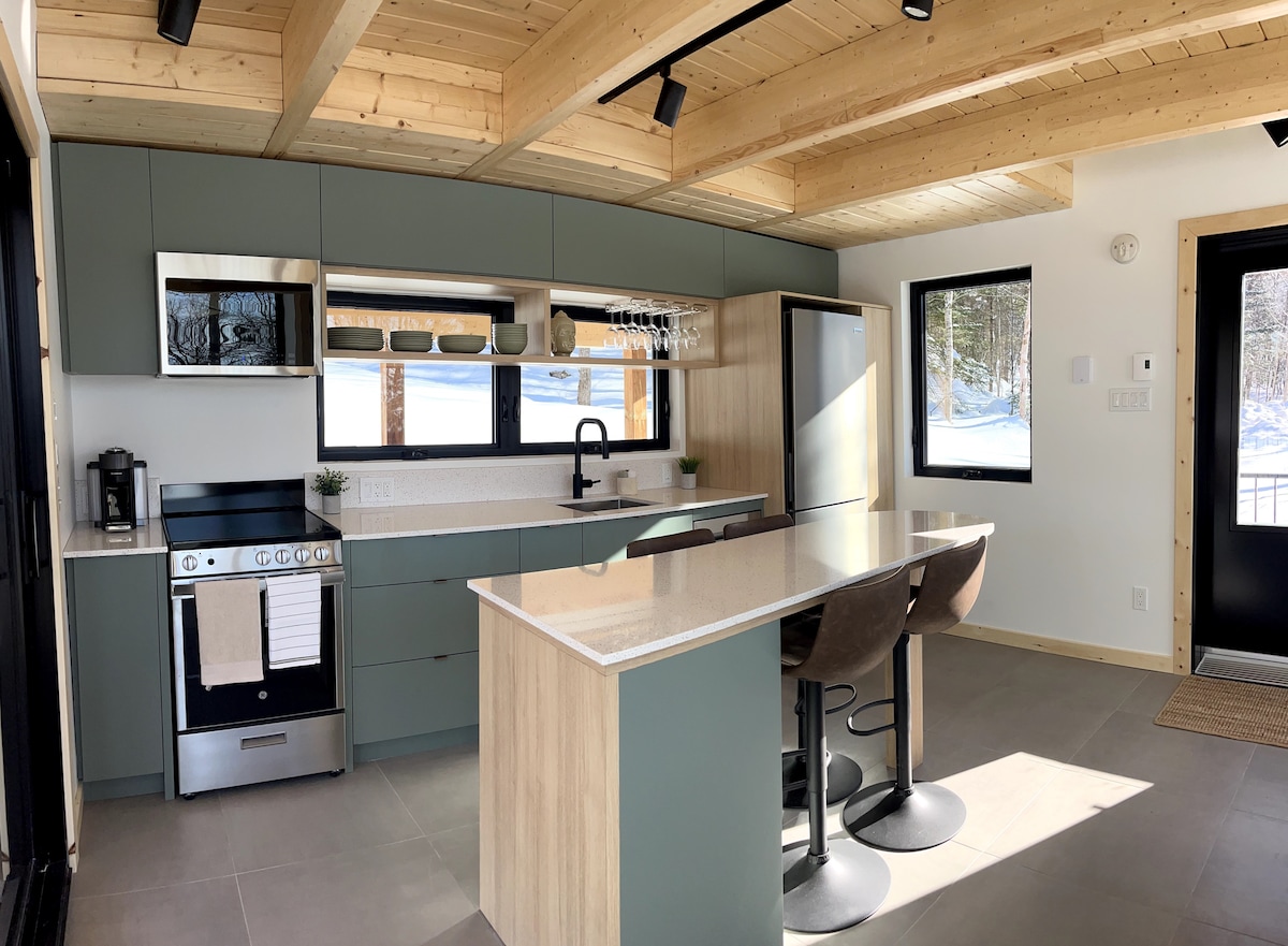 Tumakas papunta sa micro - house na ito na nasa ibabaw ng bundok at humanga sa malawak na tanawin ng mga nakapaligid na tuktok sa pamamagitan ng mga dingding na salamin nito. Magrelaks sa hot tub, naa - access sa anumang panahon, habang tinatangkilik ang pinakamagagandang paglubog ng araw. Tuklasin ang tagong hiyas na ito sa gitna ng kagubatan ng boreal sa Canada, na pinagsasama ang kaginhawaan at pag - andar sa anumang panahon. Isang matalik at di - malilimutang karanasan, malapit sa mythical city ng Quebec, isang UNESCO World Heritage Site.