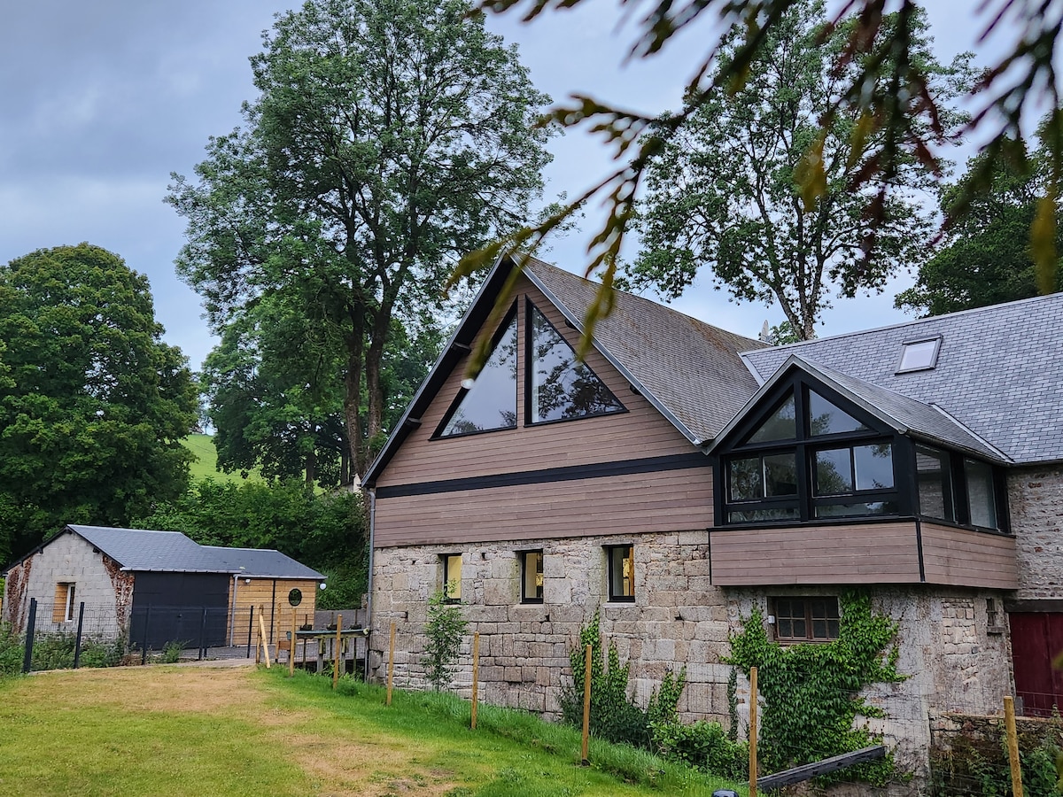 Komportableng tuluyan na inayos sa bukid, napakaluwag (mga90m²) at tahimik sa gitna ng Vire Valley. Tatanggapin ka sa isang malaking komportableng espasyo sa kanayunan, na napapalibutan ng mga hayop sa bukid at 200 metro mula sa Vire na may mga malalawak na tanawin ng lambak ng Vire. Malapit na ang canoeing base. Isang natural at maburol na lugar, para sa mga mahilig sa kalikasan at hayop. Tamang - tama para sa hiking, pagbibisikleta, pagsakay sa kabayo... Posibilidad na tumanggap ng dalawang kabayo sa halaman.