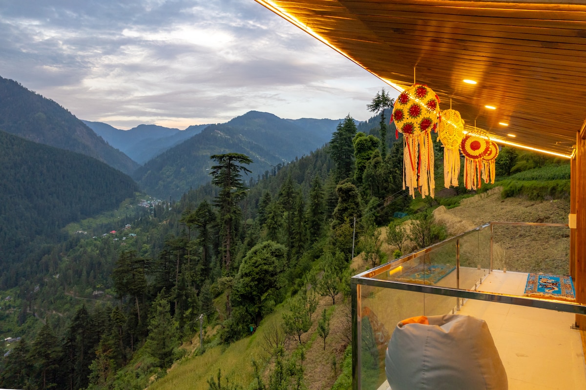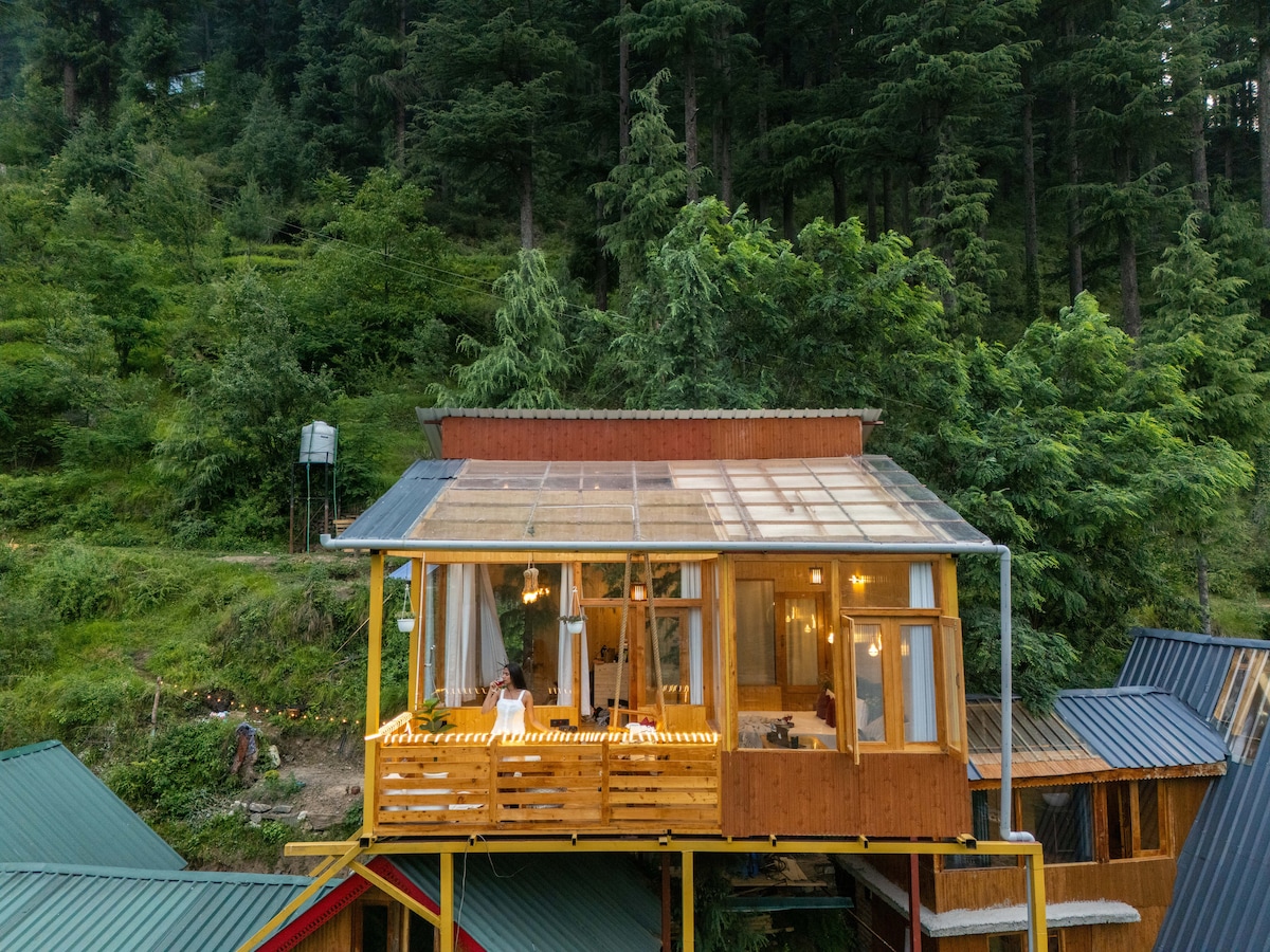 Experience the perfect blend of nature and opulence, perched atop Tandi hill near Jibhi. Delight in a luxurious soak in a hot bubble bath while relishing breathtaking views directly from your bathtub. Nestled away from road and traffic noise, the only sounds you'll encounter are the melodic chirping of birds. With an all-glass cabin, you might even spot a flying squirrel or catch a glimpse of a shooting star in serene night sky. Unwind and enjoy the tranquility of this chic, peaceful retreat.