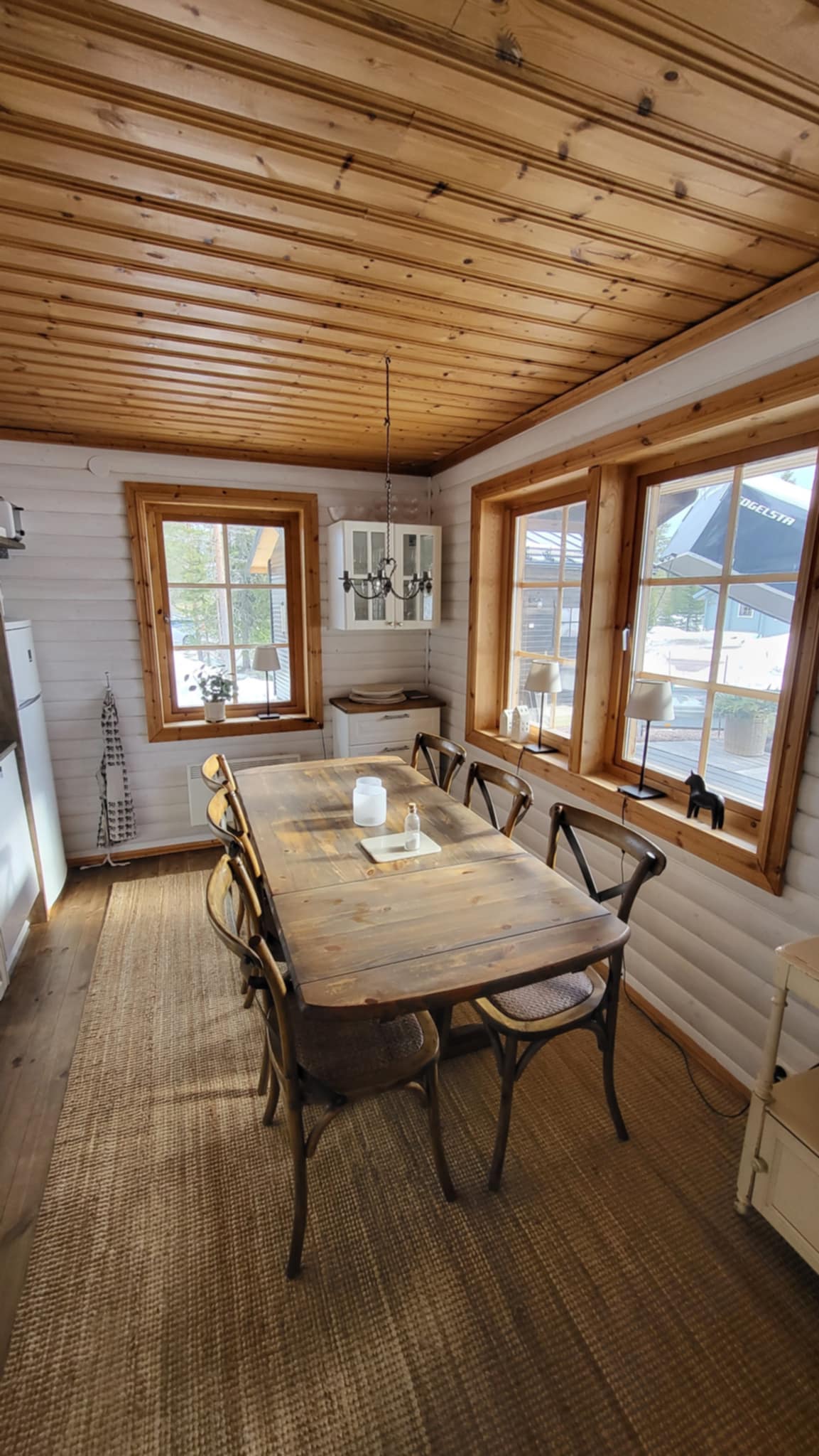 Dito maaari kang magrelaks at hayaan ang kaluluwa na magpahinga. Malapit ang kagubatan at may makatuwirang distansya sa pagmamaneho ang mga bundok. Mga berry at kabute sa mga bakuran kapag nasa panahon para dito. May rowing boat at kahoy para sa fireplace. Banyo na may shower at wash basin. Outhouse sa labas ng cabin. Kusinang kumpleto sa kagamitan. Isang double bed sa isang silid - tulugan. Sa sleeping alcove, may apat na higaan at may sofa bed sa kusina. Isang kamangha - manghang sala na pinalamutian ng lumang bahay ng bangka. Isang sauna na gawa sa kahoy sa gilid ng lawa.