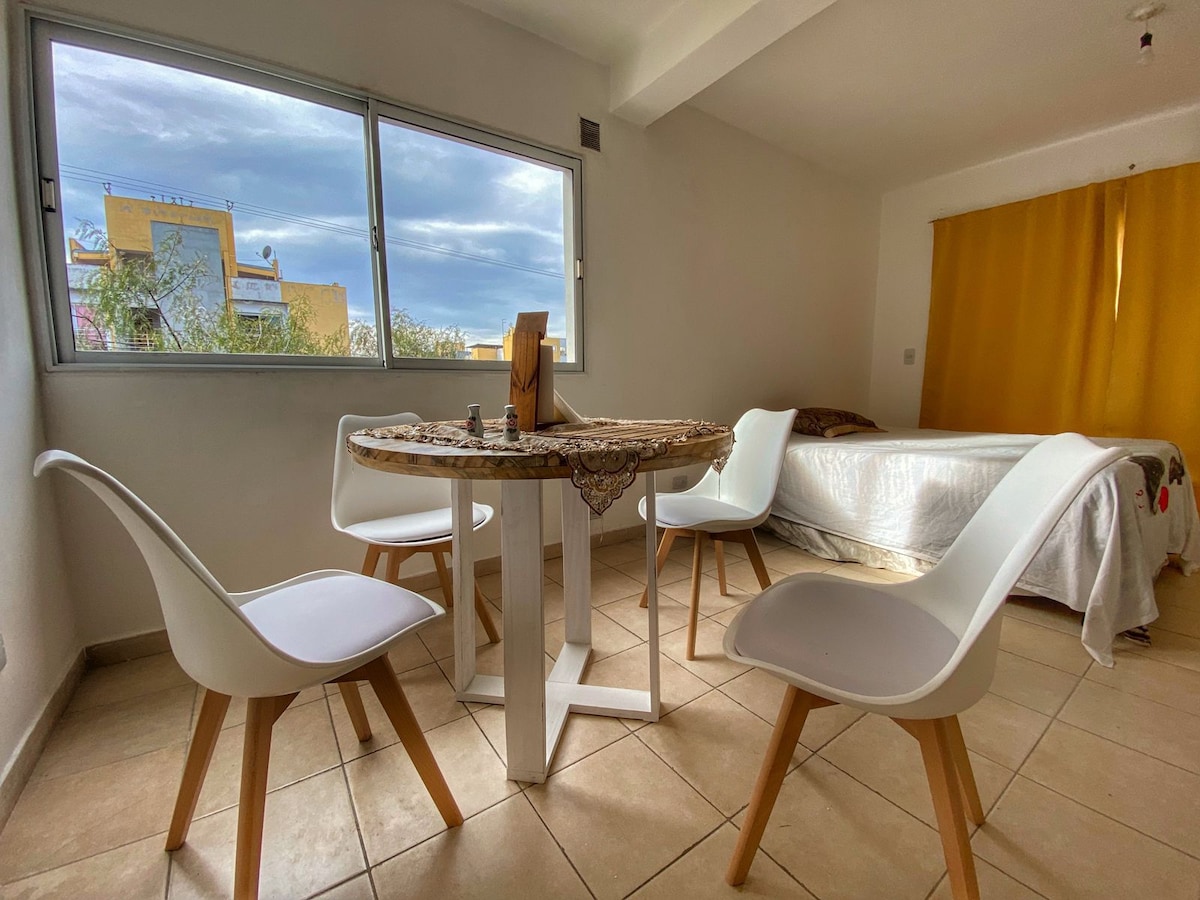 Independent apartment sa gusali, 10 minuto mula sa downtown. Sa tahimik at ligtas na kapitbahayan. Mga metro mula sa National University of Salta, Judicial City at Bicentenario Park. Mayroon itong mga pangunahing kailangan para sa komportable at tahimik na pamamalagi. Mainam para sa pahinga at turismo. Isa itong munting apartment na may isang kuwarto. May mga pangunahing kailangan. Hindi ito hotel, wala itong mga serbisyo sa kuwarto.