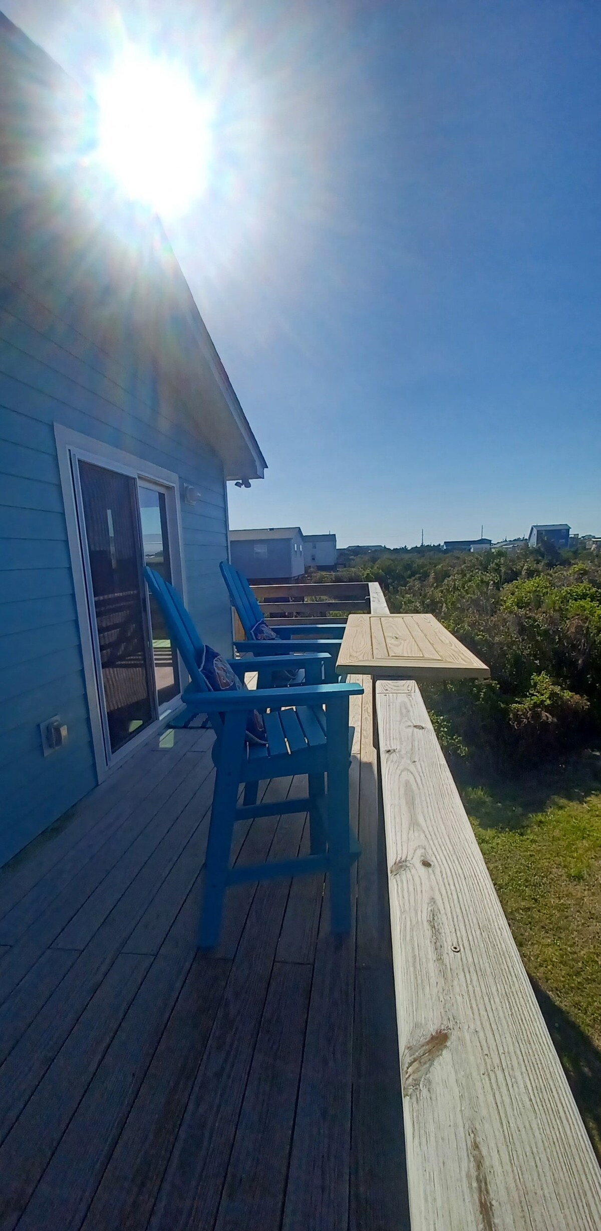 Dumating na ang taglagas at oras na para maging komportable:) Masiyahan sa mga tanawin ng marsh na may backdrop ng karagatan mula sa may takip na balkonahe ng aming munting modernong bahay sa beach. Idinisenyo at itinayo namin ang Surf Bug, na may mga detalyeng gawa‑kamay at lahat ng maaaring kailangan mo para maging komportable habang malayo sa tahanan. Tatlong minutong lakad lang ang layo ng beach at hindi kailangang dumaan sa anumang kalsada. Ako ay isang masusing panlinis, at ang puting 100% cotton bedding ay percale, na ginawa sa Portugal.