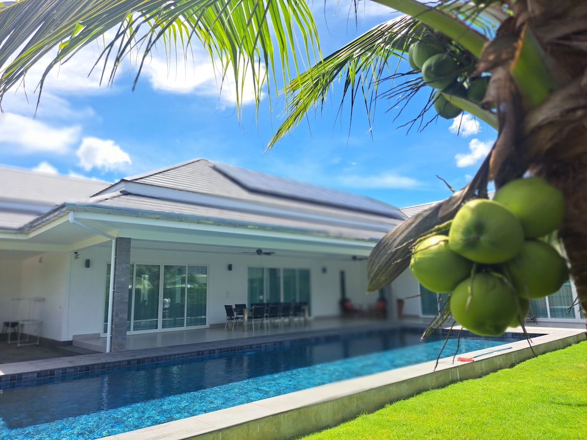 Mga villa na may malalaking pribadong pool, na matatagpuan sa magandang Hua Hin, nasa pagitan ito ng bayan ng Hua Hin at Cha - Am. May apat na silid - tulugan at apat na banyo sa villa,sala at kusinang kumpleto sa kagamitan na may microwave, oven, outdoor BBQ grill. Maaari itong paradahan ng 2 -3 kotse. Matatagpuan ang villa sa "cloud huahin" na lugar, na may 24 na oras na mga security guard. Mga 3 km mula sa beach at mga 1 km mula sa Plam Golf Club. Ito ang iyong pinakamahusay na pagpipilian para sa bakasyon. Hindi ito kasama sa bayarin sa kuryente para sa matagal na pamamalagi
