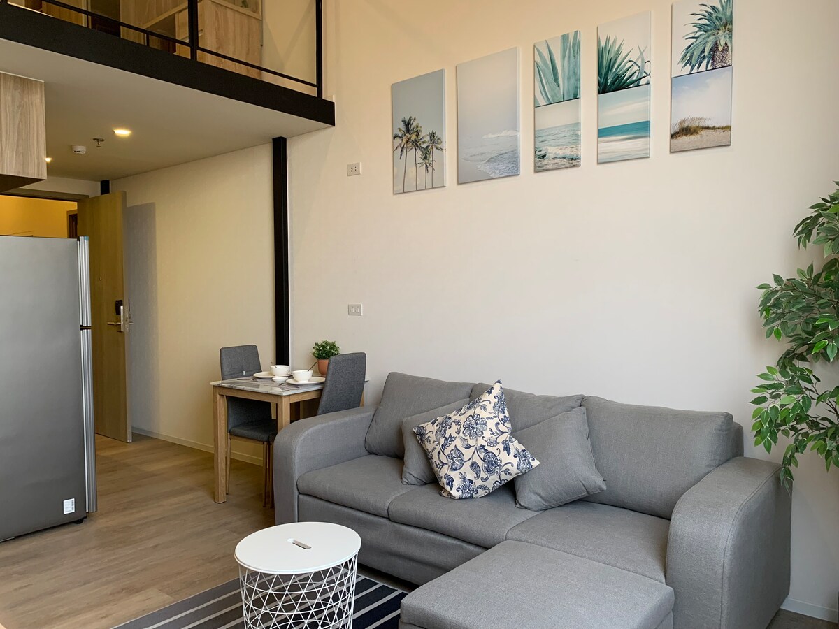 Paalala: Salamat sa pag - browse sa aming listing!Hindi naapektuhan ang aming apartment pagkatapos ng lindol at maaaring mamuhay nang payapa. Makipag - ugnayan sa akin para sa mga pangmatagalang matutuluyan!! Mga highlight ng✔✔ property✔✔ - rf top floor casual bar na may 360 degree na tanawin sa lungsod ng Bangkok (maaabot ang H1/H2 elevator) - Pangangasiwa ng serbisyo sa hotel, 24 na oras na seguridad - 1st floor Italian restaurant, swimming pool, M floor (gym, common kitchen, pampublikong lugar ng opisina) (mapupuntahan lahat ang mga elevator ng L1/H1/H2) - Banayad na loft na may marangyang estilo, nakakabighaning loft apartment - Mataas na bilis ng wifi (200Mbps) - Marka ng King Size Double Bed (2.2m Double Bed) - Kumpletong nilagyan ng mga kagamitan sa kusina at kagamitan - TV, refrigerator, washing machine, air conditioning * 2 ✔✔Transportasyon✔✔ - Libreng Paradahan - Malapit sa On Nut BTS (E9) - Dalawang hintuan papunta sa BTS Ekkamai, Car East Station, direktang linya papunta sa Pattaya - Apat na istasyon papuntang BTS Phrom Phong at mag - hang sa paligid ng Emporium, EmQuartier, Emsphere - 20 minuto para makarating sa Siam Center BTS Siam Sa paligid ng✔✔ apartment✔✔ - Lumiko pakaliwa sa pinto na may 711, sa tapat ni Lawson - Lianhua supermarket sa malapit, Century mall. - May mga lokal na tindahan ng pagkain na may estilo ng Thailand na puwedeng subukan - May massage street sa malapit ang Nut BTS para makaranas ng lokal na specialty massage service.