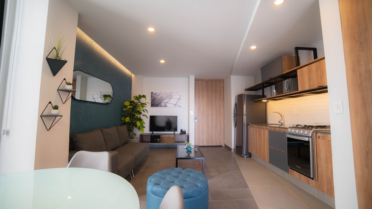 Wake up to panoramic volcano views from the 18th floor; every sunrise brings a new horizon. This modern, spacious loft blends comfort and design, perfect for families or long stays. Recently upgraded with a real bed and capacity for 6 guests. Fully equipped kitchen, electric blinds, and fast Wi-Fi. 24/7 gym, rooftop with 360° views, covered parking, and pet-friendly building with private guard and 24/7 security. Superhost with 4 years of excellent reviews.