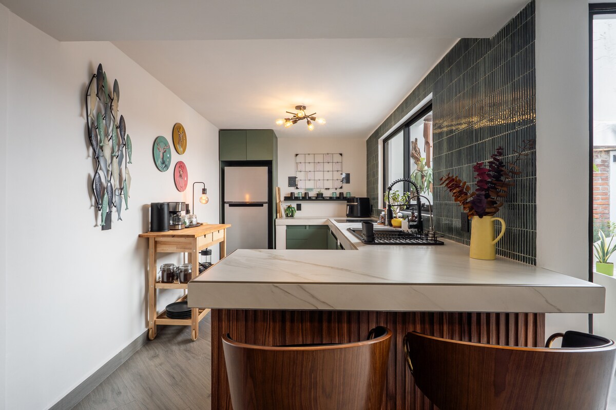 Mag-enjoy sa maluwag at magandang apartment na ito na napakaliwanag at may mga double-height ceiling. Pinalamutian ng mga kahoy na sahig at magagandang muwebles na Mexican. 5 star sa kalinisan at pangangalaga. May sariling pag‑check in. Isang perpektong lugar para magpahinga at tuklasin ang Mexico City. Nasa bagong DOMAIN TOWER ito, sa isang magandang lugar sa South City ng Mexico City. Mayroon kaming high-speed Wi-Fi: mahigit 100 Mbps. May modernong gym na kumpleto sa kagamitan sa gusali.