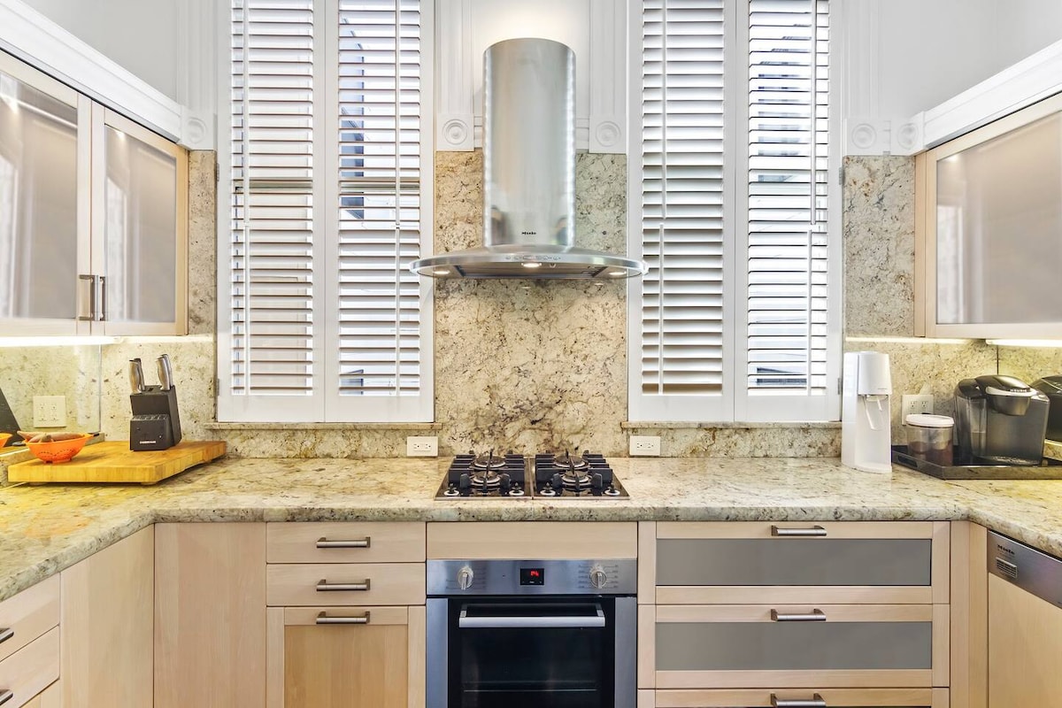 Buksan ang malalaking pinto ng bulsa sa pagitan ng master bedroom at sala at lumubog sa komportableng couch sa harap ng statement fireplace. Ang apartment na ito ay puno ng mga katangi - tanging kahoy na kasangkapan at mapang - akit na likhang sining. Bumubukas ang couch na ito sa isang komportableng higaan kung kailangan ng pangatlong higaan. Sa ikalawang silid - tulugan ang Murphy Bed ay nilagyan ng Room at Board mattress na maaaring nakatago upang mabuksan mo ang drop leaf table at gawing pormal na silid - kainan ang kuwartong iyon.