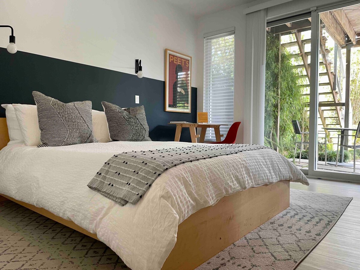 Wake up to the soothing green view from this recently remodeled (mid-2023) studio nestled on a sleepy block in Bernal Heights. A peaceful backyard with a Buddha sculpture and a modernist inspired courtyard sit alongside the bedroom, kitchenette and bathroom. Free street parking (parallel) is available on my block and surrounding streets, not restricted, and typically easily available. Note that the in-law studio shares a common front door and foyer with the main house upstairs.