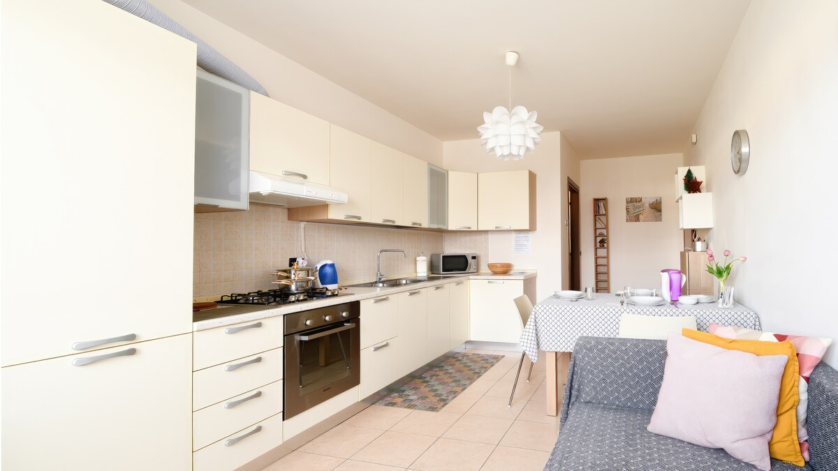 Magandang apartment na may air conditioning, washing machine at ilang espasyo sa labas. 100 metro mula sa hintuan ng bus at tindahan na nagbebenta ng sariwang prutas at gulay at pang - araw - araw na pamilihan. Kung interesado ka sa mga lokal na pagkain at alak, maaari ka naming bigyan ng payo tungkol sa mga kalapit na tindahan at bukid. Mas malaking supermarket na bukas nang 7/7 wala pang 10 minuto ang layo (habang naglalakad). 20 minutong lakad ang layo ng kastilyo ng bayan (sa Prosecco Hills). Malapit lang ang tinitirhan namin, nagsasalita kami ng Italian pero tinutulungan kami ng mga anak na tumanggap ng mga dayuhang bisita.