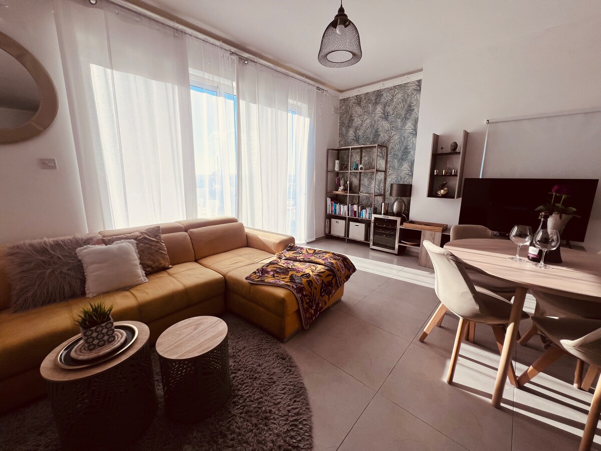 Bagong apartment na gawa ng designer, nasa ika-25 palapag ng Mercury Towers ni Zaha Hadid. Gumising nang may nakamamanghang tanawin ng dagat at lungsod sa bawat sulok, kabilang ang banyo, sofa, hapag‑kainan, o balkonahe. Mag‑relax sa modernong kusina na may magagandang baso ng wine at coffee machine, mga pader na gawa sa itim na marmol, smart TV na may Netflix, at mga upuan sa outdoor lounge. Mag‑enjoy sa libreng access sa mga rooftop pool at tower pool, gym, at spa. Tamang‑tama para sa trabaho, matatagal na pamamalagi, o mararangyang bakasyon. Ikalulugod kong i - host ka!