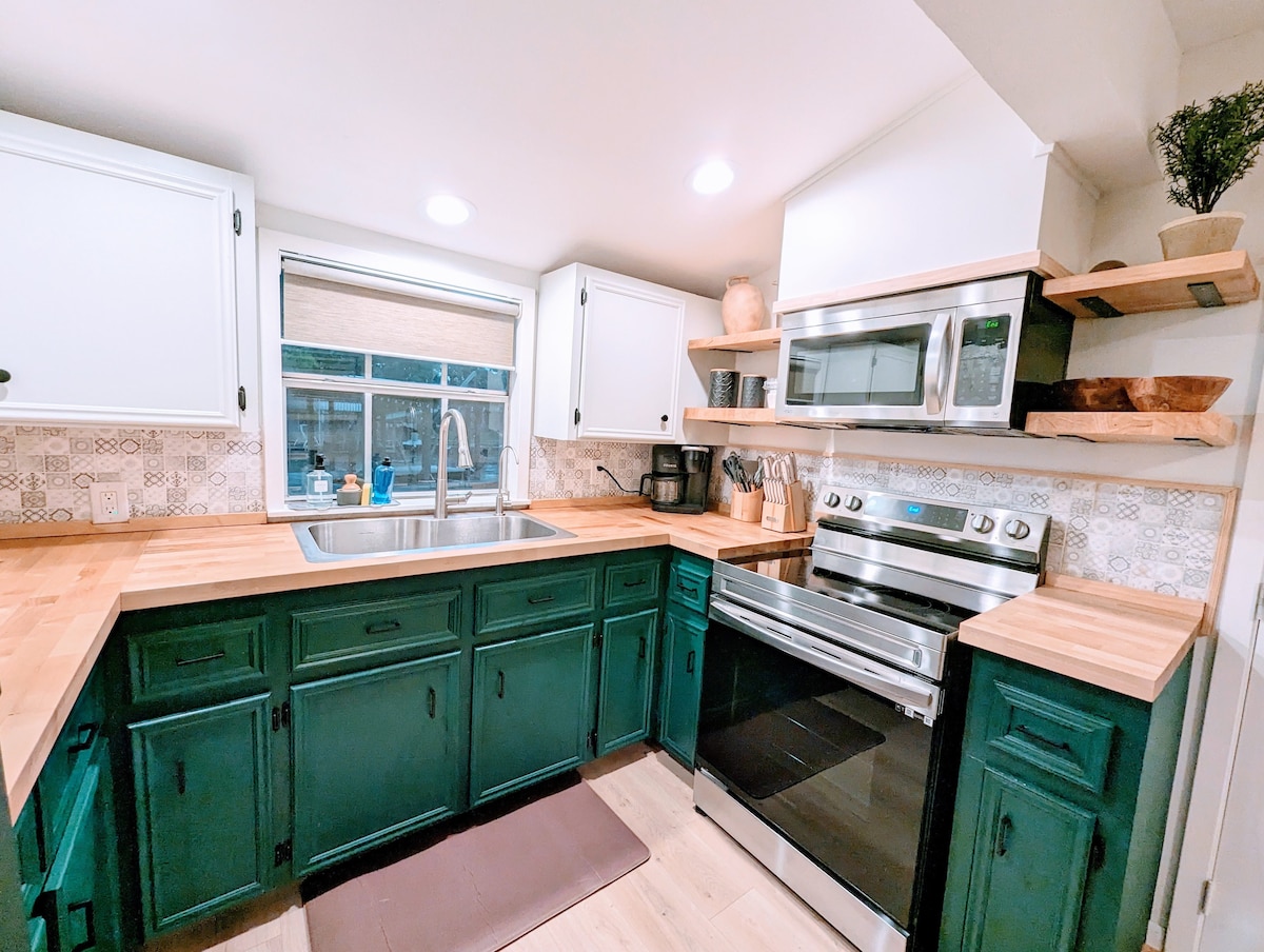 Walang bayarin sa paglilinis!!!! Pribadong cottage na 350 sq ft sa pinaghahatiang property na 1.3 acre na itinayo noong 1952 na may sariling pasukan at pribadong bakuran sa gilid na may fire pit. Mukhang villa ito dahil sa vaulted ceiling. Maglakad papunta sa mga tindahan at restawran sa downtown Livingston. Malinis, simple, at pinag‑isipang mabuti—mainam para sa mga biyaherong mag‑isa o magkasintahan na mas gusto ang pagiging maganda kaysa sa pagiging marangya. Nakatira sa lugar ang pamilya sa pangunahing tuluyan. Maaaring may naririnig kang mga karaniwang gawain, at maaaring magsabi ng kumusta ang aming border collie na si Loki.