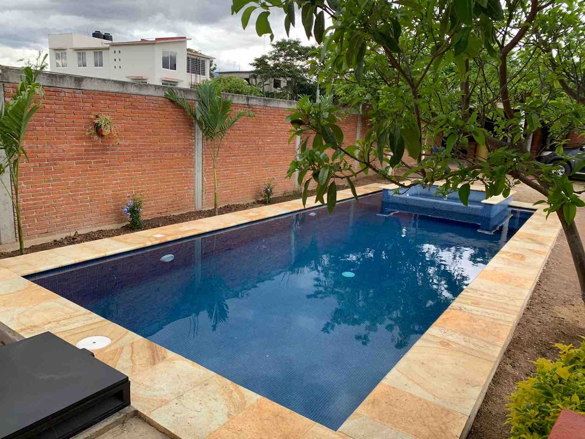 Ang aming bahay ay isang tradisyonal na hacienda - type na bahay. Ang mga silid - tulugan ng bisita ay may mga entry lamang sa labas ng patyo. Naghihintay ang pribadong heated pool para sa nakakarelaks na paglangoy pagkatapos ng buong araw na pagtuklas sa mga guho o paglilibot sa mga kalapit na pueblos! Ang Lachigolo ay isang maliit at mapayapang pueblo, mga 15 minutong biyahe mula sa Oaxaca sa kahabaan ng Pan American Highway, at mga 5 minuto sa nakalipas na El Tule. Maganda ang lokasyon para sa mga day trip sa mga lugar tulad ng Hierve al Agua, Teotitlan, at Mitla.