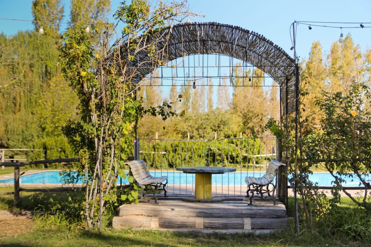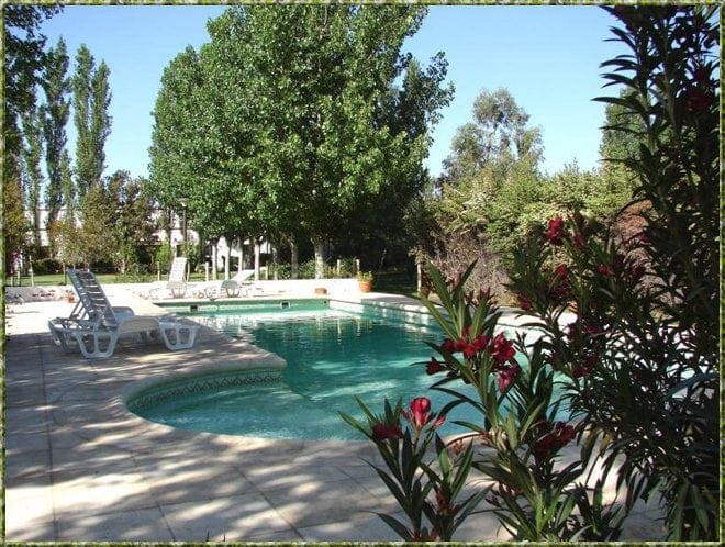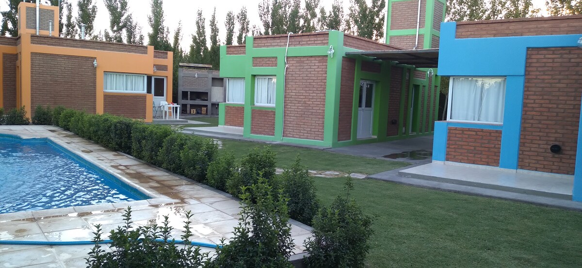 Casita muy bonita, con piso parquet y galería. Gran Parque. 2 TV satelital independiente. A 10 minutos de la ciudad, sobre ruta 40 entre calle 8 y 9, viniendo de Air a norte, muy bien ubicado. Atendido por personal de la zona. Rodeado de plantaciones de olivo. Restaurant a 100 metros. Mercado a 500 metros. Delivery. Todos los servicios. Wi Fi. Entrada independiente a cochera y a piscina. Parrilla. Cocina Completa.
