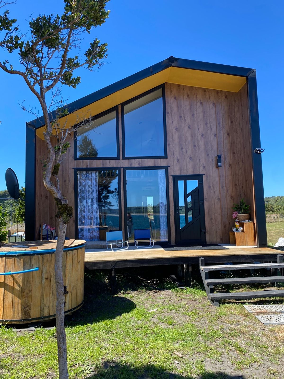 Conecta con la naturaleza en esta escapada inolvidable. Has que tu vista navegue por los fiordos y bosques chilotes. Por la tarde relaja tu cuerpo y mente en la tinaja caliente bajo las estrellas. Su forma de lancha y entorno natural te darán la sensación de flotar por los mares de Chiloé. Mini Cabaña Lancha Marina posee una hermosa arquitectura para hacer de tu descanso un éxito. Refuerza tu sistema inmunológico con baños de bosque en nuestro hermoso sendero nativo y visita el bosque fósil.