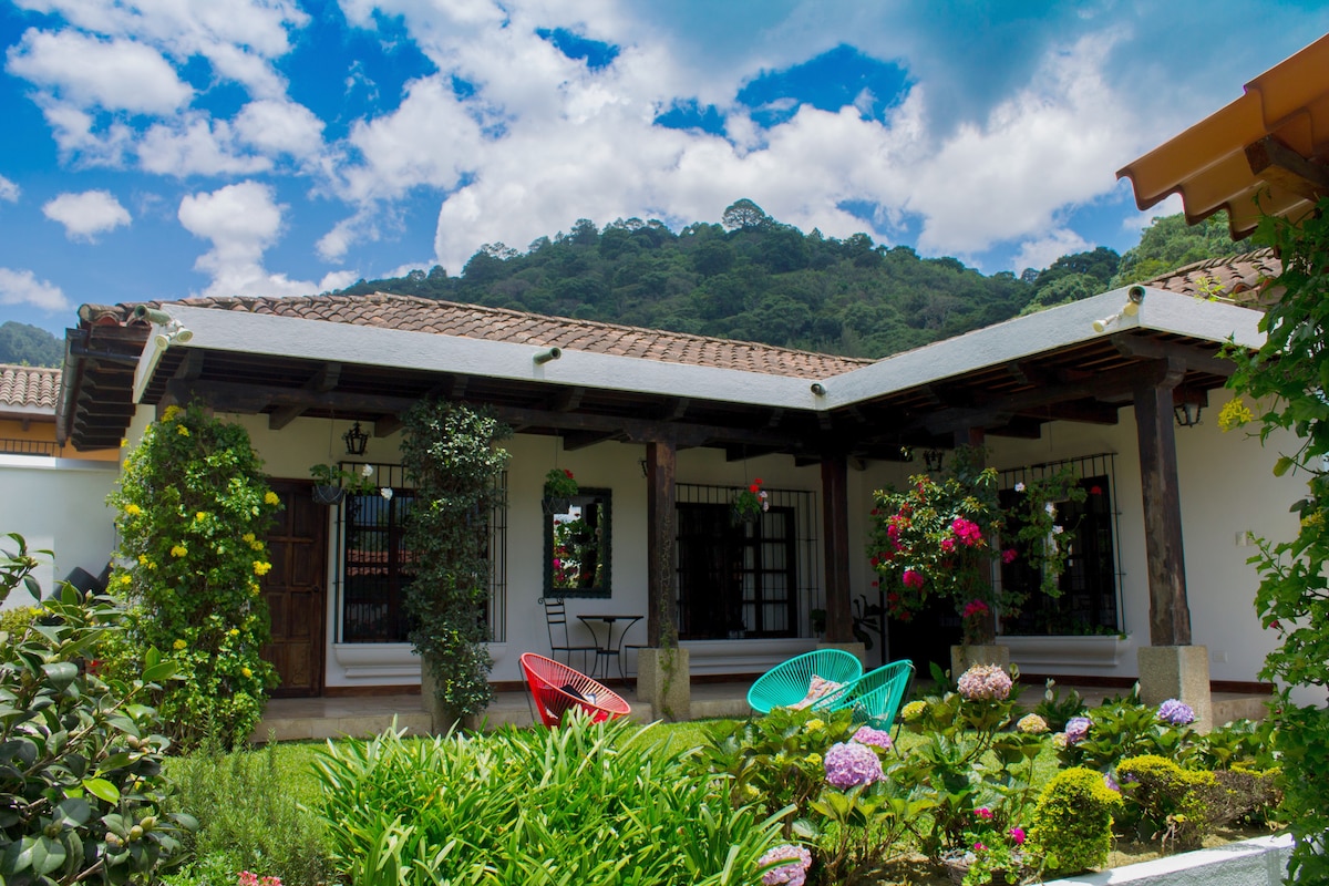 Magrelaks sa natatangi at mapayapang bakasyunang ito. Masiyahan sa kalikasan sa pamamagitan ng banayad na pag - aalsa ng mga puno, makulay na kulay ng mga bulaklak, matamis na ibon, at nakapapawi na tunog ng tubig mula sa aming fountain. Mamangha sa tanawin ng mga nakamamanghang bulkan na Agua, Acatenango at Fuego. Perpektong lugar para magpahinga at magpahinga pagkatapos maglakad sa Colonial City ng Antigua Guatemala at masiyahan sa mga aktibidad nito, pangkultura, gastronomic at 500 taon ng kasaysayan nito.