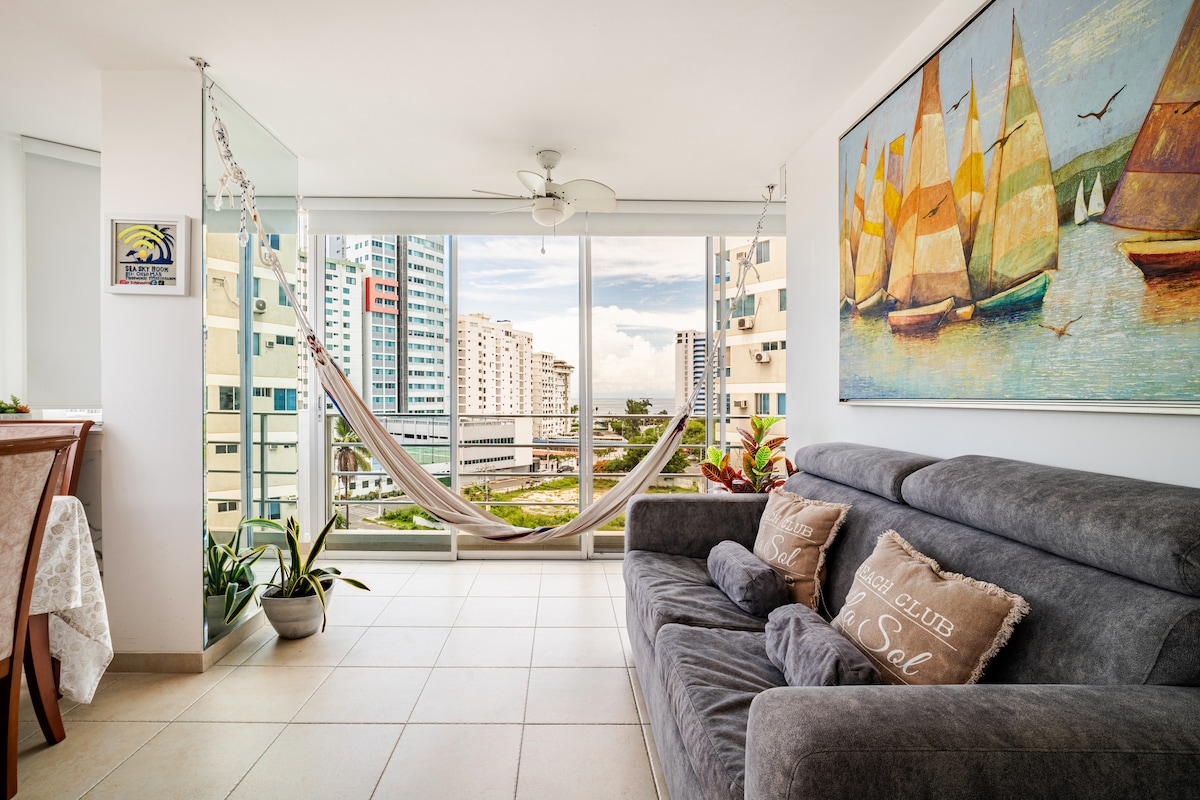 Natatanging modernong apartment na maaliwalas at kumpleto ang kagamitan na may magandang tanawin ng Chipipe/Mar Bravo. May air conditioning para sa 3 tao. May sala at dining room. May internet at wifi. Mararangyang gusali na may mga serbisyo ng kategorya. Sa paanan ng Chipipe beach, katabi ng Military Base, ilang metro mula sa Chocolatera, Lobería Mirador el Morro. Ligtas na residential area mainam para sa pagbibisikleta at paglalakad sa kahabaan ng beach, makakakita ka ng mga natatanging paglubog ng araw mula sa mga balkonahe. 1 paradahan may libreng electric access gate. Lobby/Reception 24/7