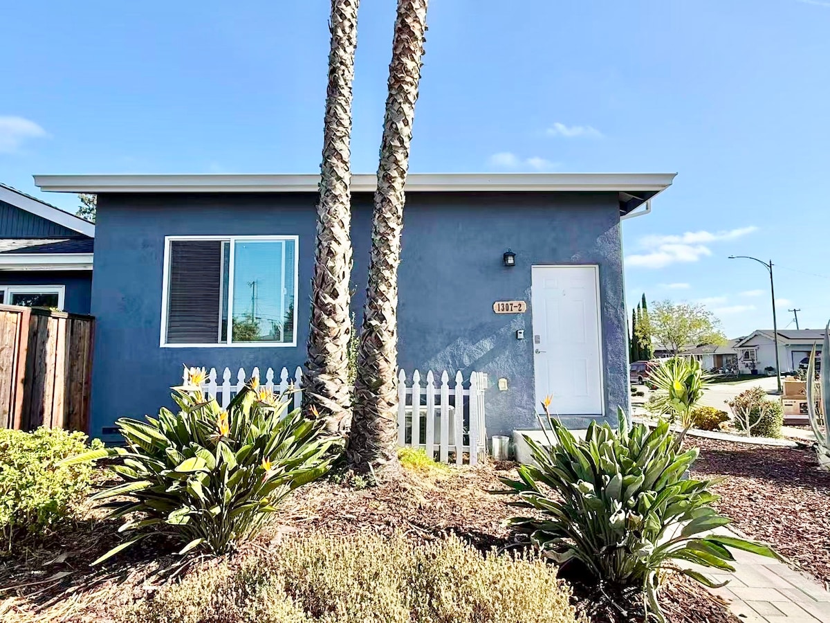 Our lovingly designed cozy but SMALL studio is perfect for solo travelers or couples. Modern design, upscale European stone/tile work in kitchen and bath. Private patio, parking w/ secure gate, laundry, electric fireplace, rainfall shower, LED vanity mirror, Keurig, desk, strong Wi-Fi, fully stocked kitchen w/ utensils and cookware. close to SJC Airport, SJSU campus, SAP Center, Convention Center, Downtown SJ, HWY-87, tech companies like Zoom, Adobe, PWC, EY. Walk to Japantown.