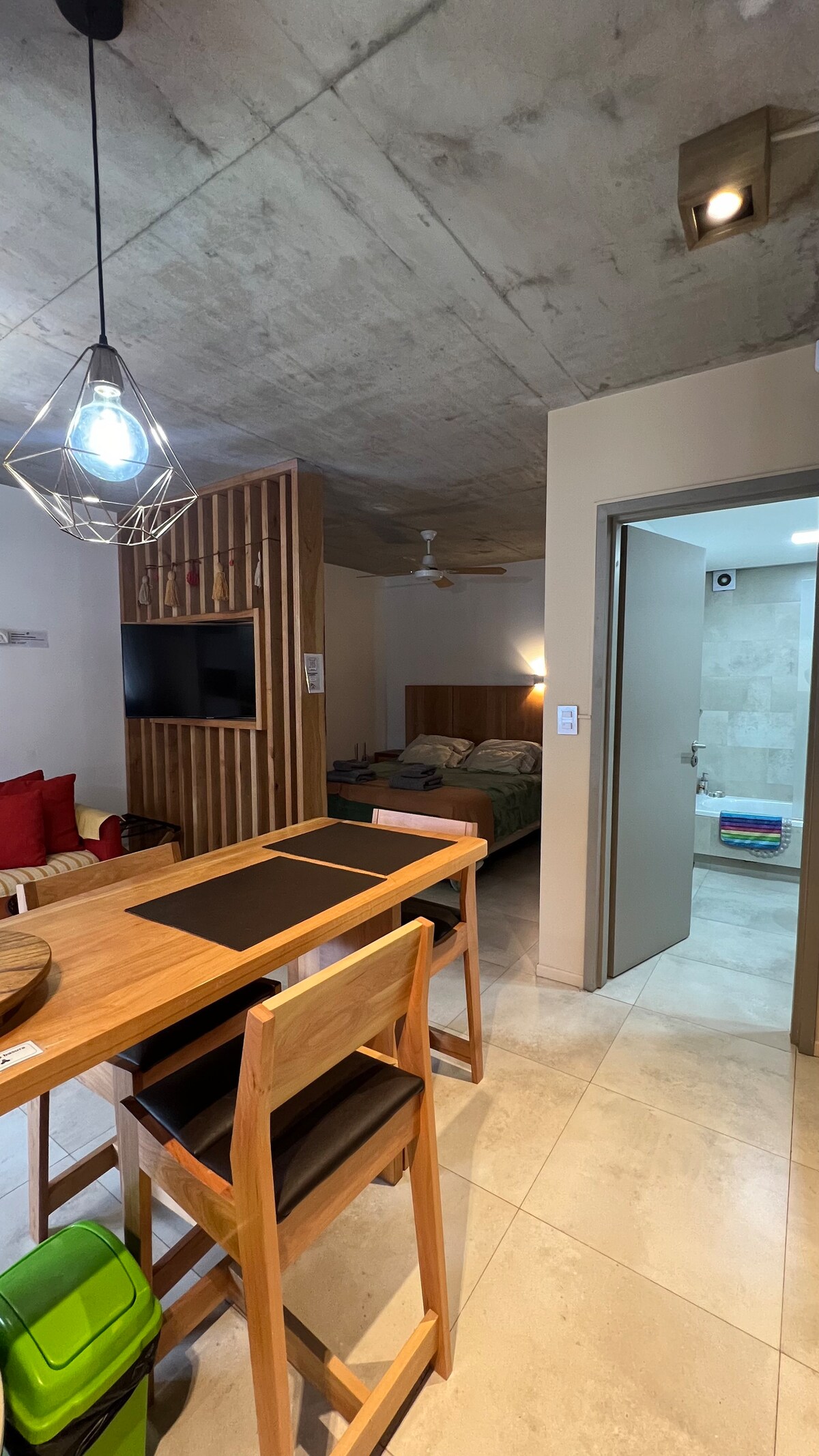 Maganda, bagong inilabas na 40 - square - meter studio, napakaliwanag at moderno, na may magandang tanawin mula sa iyong unang palapag na balkonahe. Mayroon itong mainit at komportableng kapaligiran at nilagyan ng 1 queen sommier at 1 single bed na may mahusay na kalidad; sobrang kusinang may breakfast bar at buong banyo. Mayroon itong smart TV na may cable at WiFi. Matatagpuan sa sentro, 3 bloke mula sa pangunahing Avenue, 8 mula sa lawa at mga hakbang mula sa mga tindahan tulad ng mga restawran, rotiserías at supermarket. Isang dream apartment.