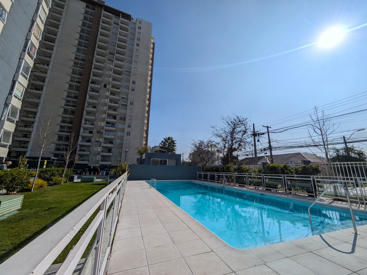 Apartment 2 silid - tulugan, 2 banyo at paradahan na may tanawin ng Cordillera. Apartment na kumpleto ang kagamitan. Hab One: 1 kama 2 kama, banyo, TV at Air/A Ikalawang Kuwarto: 1 1.5 square bed, 1 trundle bed, banyo at aparador Pamumuhay gamit ang TV 55", armchair Mga silid - kainan na may 4 na kuwadra Paradahan 1 stall Kusina na kumpleto ang kagamitan Pool at Gym Malapit sa Est/Metro Estadio Nacional, C.C Portal Ñuñoa y Universidad de Chile. Ang kapitbahayan ay napaka - tahimik, maganda at ligtas. 24/7 na concierge