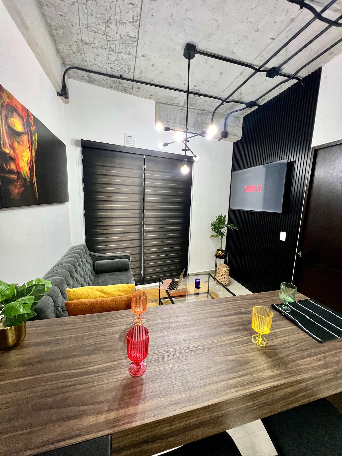 Moderno loft , cómodo con entrada independiente , cajita con clave. Tranquilo. Wifi. Tele con smart Tv. Agua caliente fría. Microondas. Cama Quin size lugar tranquilo con mesa y lugar para sentarse. Minisplit. Refrigerador. Microondas. Abanico toallas. Jabones de cuerpo shampoo y de manos.licuadora secadora de pelo plancha y tabla para planchar.cuenta con pequeña cocineta. Microondas. Tostador. Licuadora. Parrilla. Platos vasos y tarja para lavar trastes.frigo bar. Secadora de pelo.