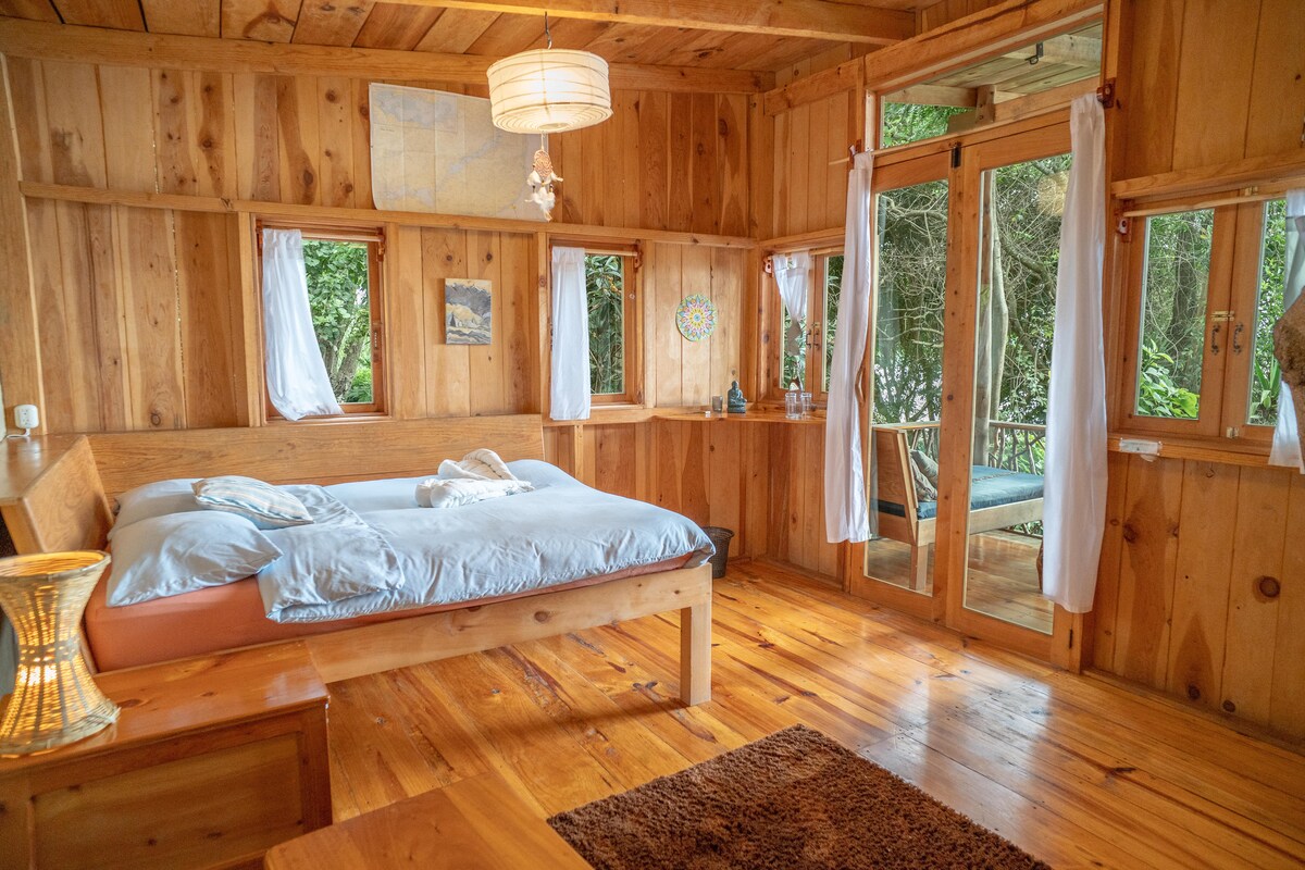 Cozy, Handcrafted A-Frame Cabin with Stunning Views Tucked into the hillside above Lake Atitlán, this one-of-a-kind A-frame is an artistic, eco-conscious hideaway. Surrounded by lush tropical gardens, guests can harvest fresh fruits and herbs while enjoying modern comforts like high-speed internet, a king size memory foam bed, and a gas-heated rainfall shower. Perfect for a romantic getaway or solo travelers seeking inspiration and peace.