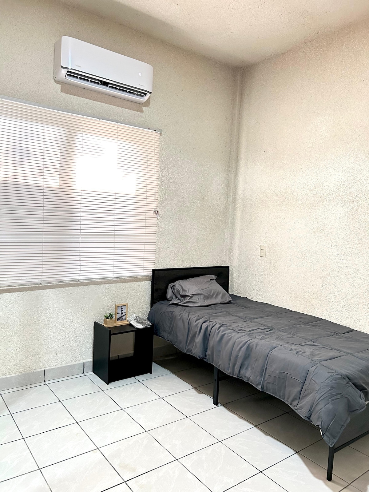 Esta habitación privada con entrada independiente cuenta con las siguientes amenidades: -Aire acondicionado - Baño propio - Dos camas individuales - Cocineta. - Ventiladores de techo - Refrigerador - Mesa para trabajo/ estudio - Mesa de comedor, etc... La ubicación céntrica permite desplazarse fácilmente a distintos lugares de servicios en la ciudad cómo tiendas de autoservicio, abarrotes, escuelas, bares, sitios de taxis, parque central, centro de salud, etc.