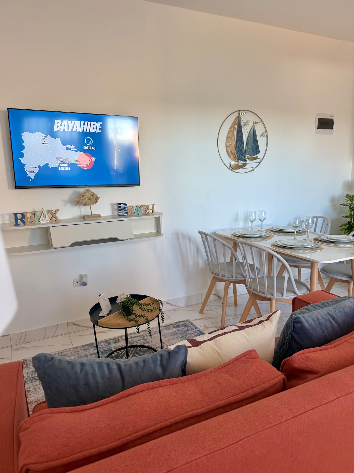 A solo 1 minuto caminando de la playa privada (visible desde la puerta del apartamento), ubicado en área más exclusiva de Bayahibe, Dominicus. Dentro del exclusivo resort Cadaqués: 3 piscinas, muelle privado, parque acuático, restaurante, bar-café, jardines tropicales, Cama king cómoda y sábanas de 300 hilos, A/C de 24,000 BTU, silla columpio (hasta 350 lb), cocina equipada, WiFi rápido y Smart TV, libros, juegos de mesa. Todo listo para que vivas una estadía inolvidable y cómoda en el paraíso!