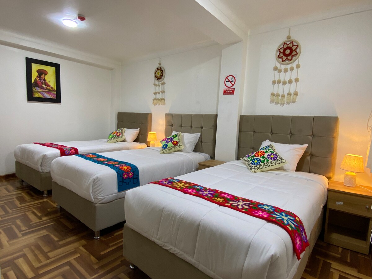 Room on the 3rd level of the hotel, has a double bed for 2 people and a private bathroom. Free breakfast. TATA Hotel is located 250 meters from the Plaza de Armas of Cusco, the safest and most touristic place in Peru. You can find around the hotel the best restaurants and coffee shops in the area, also a few meters away you have banks, pharmacies and markets available. We provide tourist services throughout the city. Enjoy your stay with us. We will wait for you!