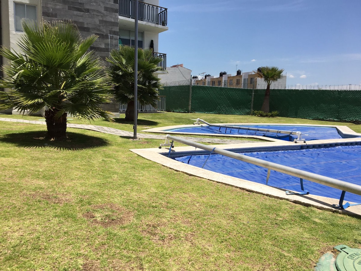 Maligayang pagdating! Tamang - tama para sa mga mag - asawa, pamilya, at/o grupo sa Fracc. Pribado na may 24 na oras na seguridad. 5 minutong lakad ang layo ng Av. Juarez (Access sa Puebla Center), 10 min. mula sa Volkswagen, 15 min. mula sa Cholula, 5 min. mula sa Centro Comercial Galerías Serdán, 15 min. mula sa Angelópolis Shopping Center. Sa isang bahagi ng Subdivision, isang Wal Mart, at isang Mexican Commercial Mega. 3 parking space at mga common area sa subdivision na may mga larong pambata, basketball court at mga barbecue.