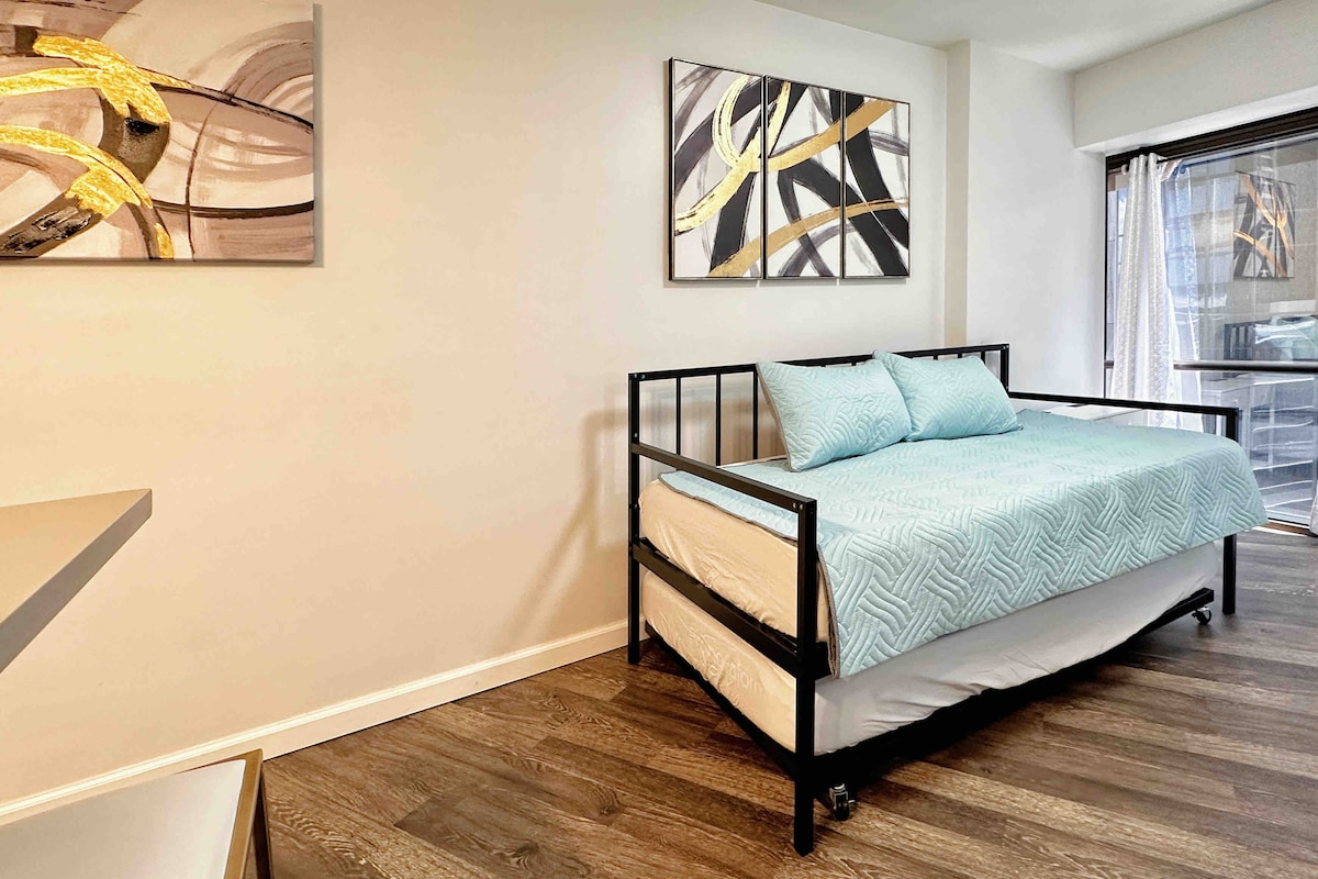 Bagong na - renovate na 1Br; central AC, 570 sqft na may mga bintanang mula sahig hanggang kisame. Makatipid ng $35 kada gabi na may ligtas na libreng paradahan sa gusali at libreng wifi at kusinang kumpleto sa kagamitan. Maglakad papunta sa pinakamagagandang restawran at bar, ang Chinatown. May magagandang amenidad ang gusali kabilang ang lap pool at hot tub, 24/7 na seguridad. Starbucks/Ross/grocery sa ground floor para sa iyong pang - araw - araw na pangangailangan.