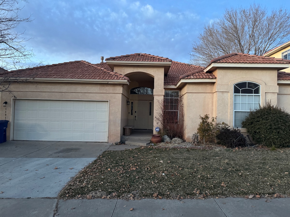 Masiyahan sa isang magandang inayos na 3 - silid - tulugan na tuluyan na may dalawang maluluwag na sala at isang malaking bakuran na perpekto para sa pagrerelaks. Nagtatampok ang modernong interior ng kusinang may kumpletong kagamitan at mga komportableng kuwarto para sa komportableng pamamalagi. Matatagpuan 10 minuto lang ang layo mula sa Sandia Mountains at malapit sa magagandang restawran, mainam ang tuluyang ito para sa mga pamilya, kaibigan, o business traveler. I - book ang iyong pamamalagi ngayon at maranasan ang pinakamaganda sa lugar!
