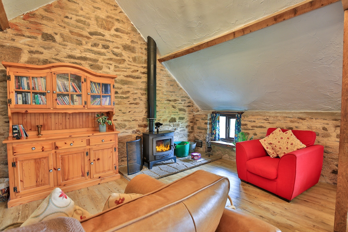 Inayos na kamalig sa 100 ektaryang lupa. Isang tahanang parang tahanan na puno ng mga libro, laro, at laruan. Madaling makakapamalagi ang kahit man lang 10 tao nang komportable. Para sa iyo lang ang hardin, lawa, kakahuyan, at mga paradahan sa panahon ng pamamalagi. Nakatira kami sa may kalye mula sa kamalig. Para magkaroon ka ng privacy. May mga manok, pato, tupa, at baboy sa bukirin. 5 minutong biyahe mula sa J28 ng M5. 20 minutong biyahe mula sa sentro ng Exeter. Hindi malapit sa anumang magandang beach kaya huwag piliin ang sa amin para sa isang bakasyon sa beach. Walang spa o hot tub.